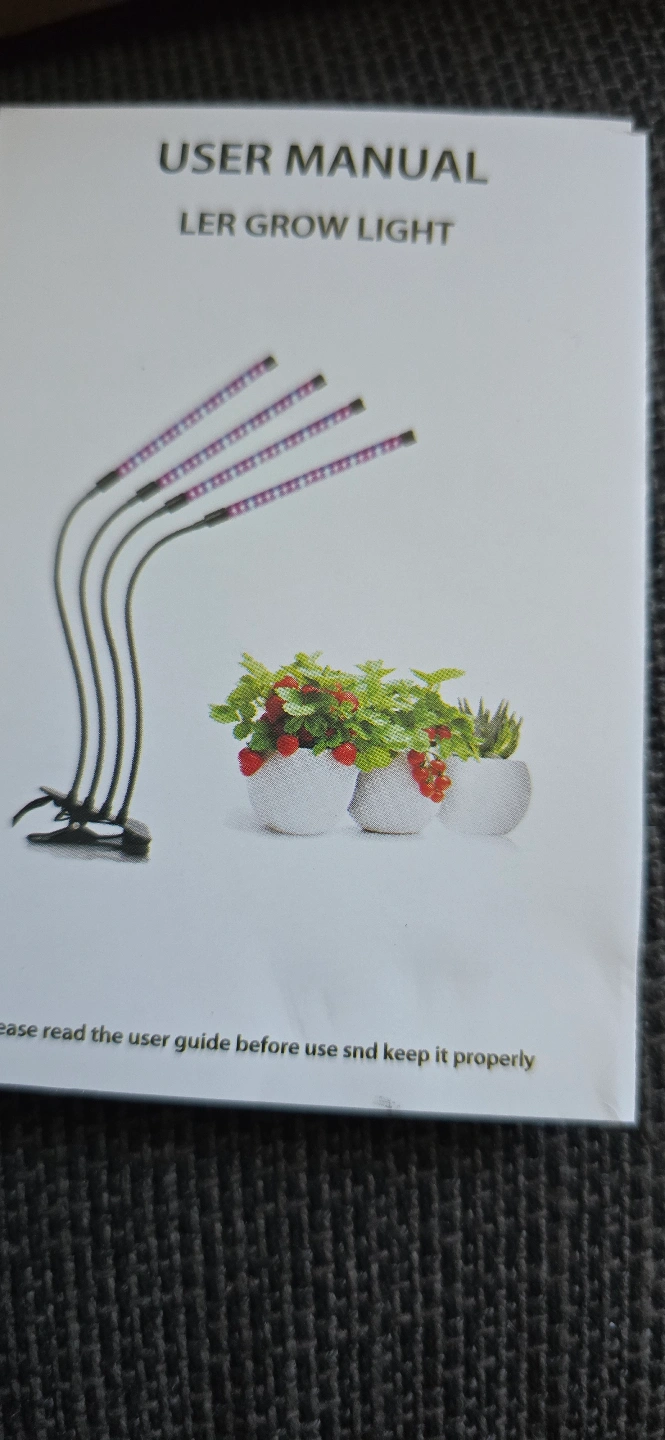 Indoor grow light, four flexible gooseneck heads. Full spectrum, adjustable brightness. Includes USB power adapter. Ideal for home, greenhouse, or office.