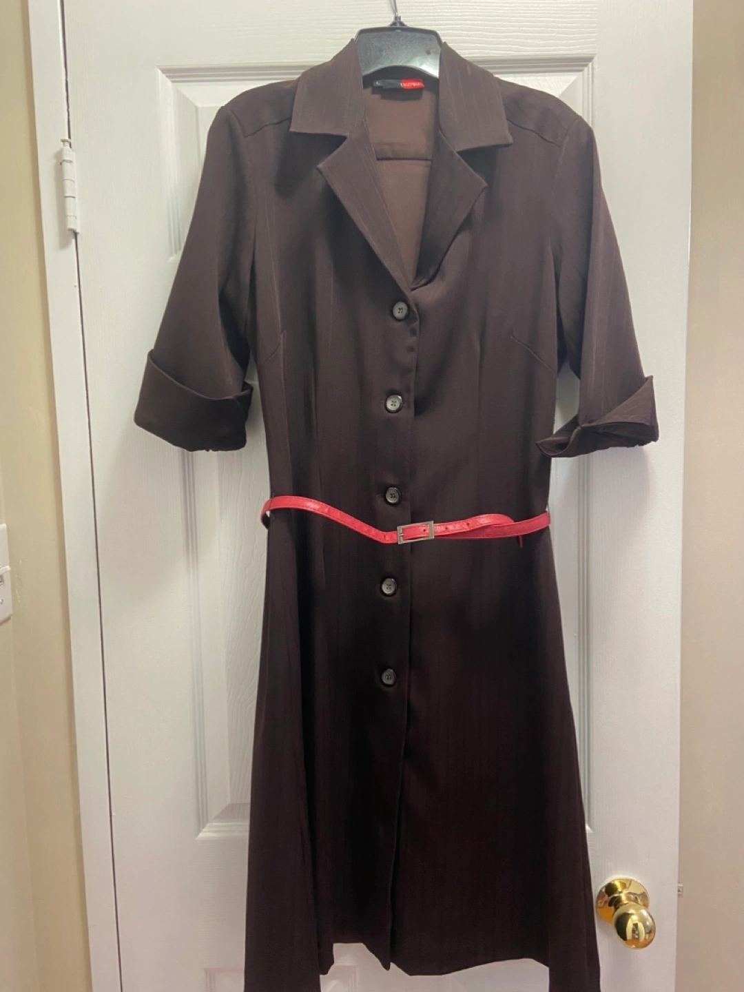 This shirt dress is a stylish and versatile addition to any wardrobe, featuring a button-up front, collared neckline, and a flattering silhouette, complete with belt loops to cinch the waist. Please note that the dress for sale does not include the red belt.