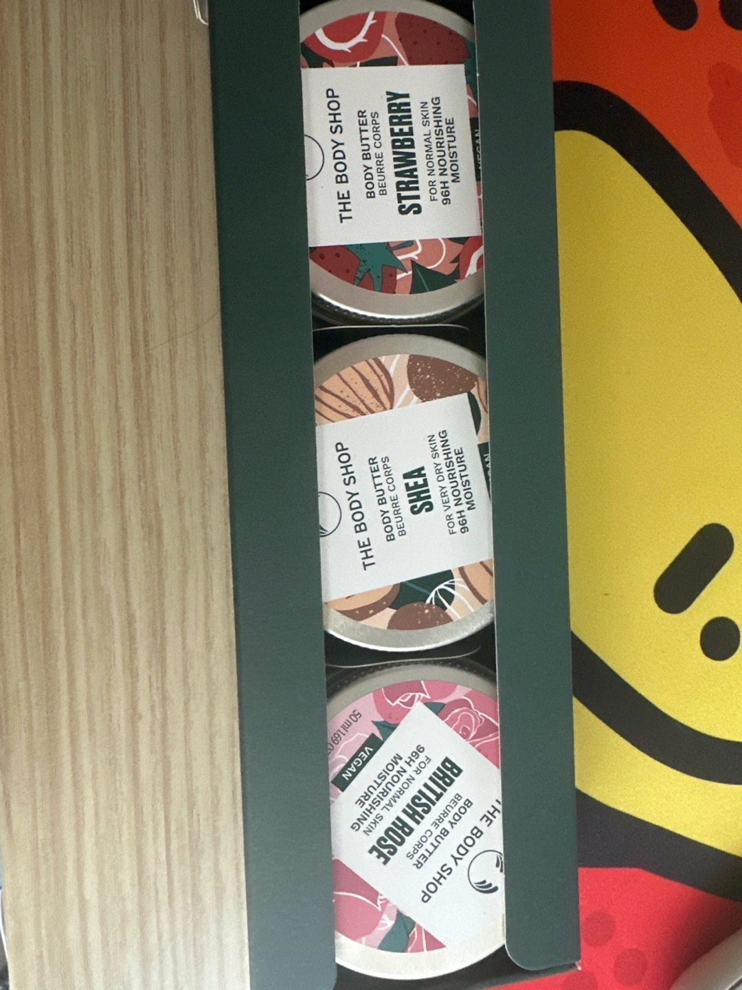 New, unopened Body Shop body butter trio. Includes Strawberry, Shea, and British Rose scents. Perfect gift.