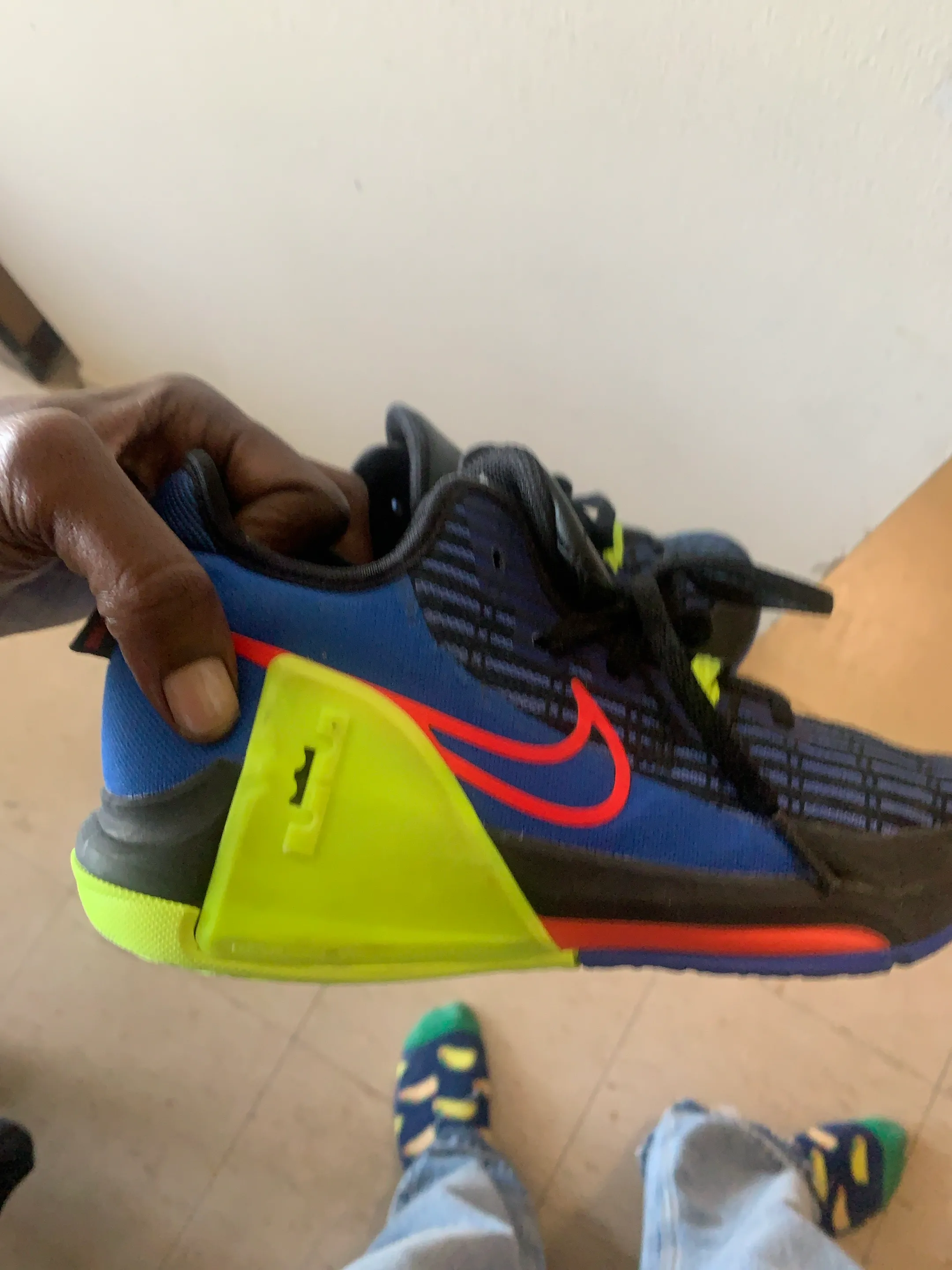 Kids size2y basketball shoes. Blue, black, neon yellow, and red accents. Lace-up closure. Durable outsole. Great for the court. Minor wear and tear, still has a lot of life.