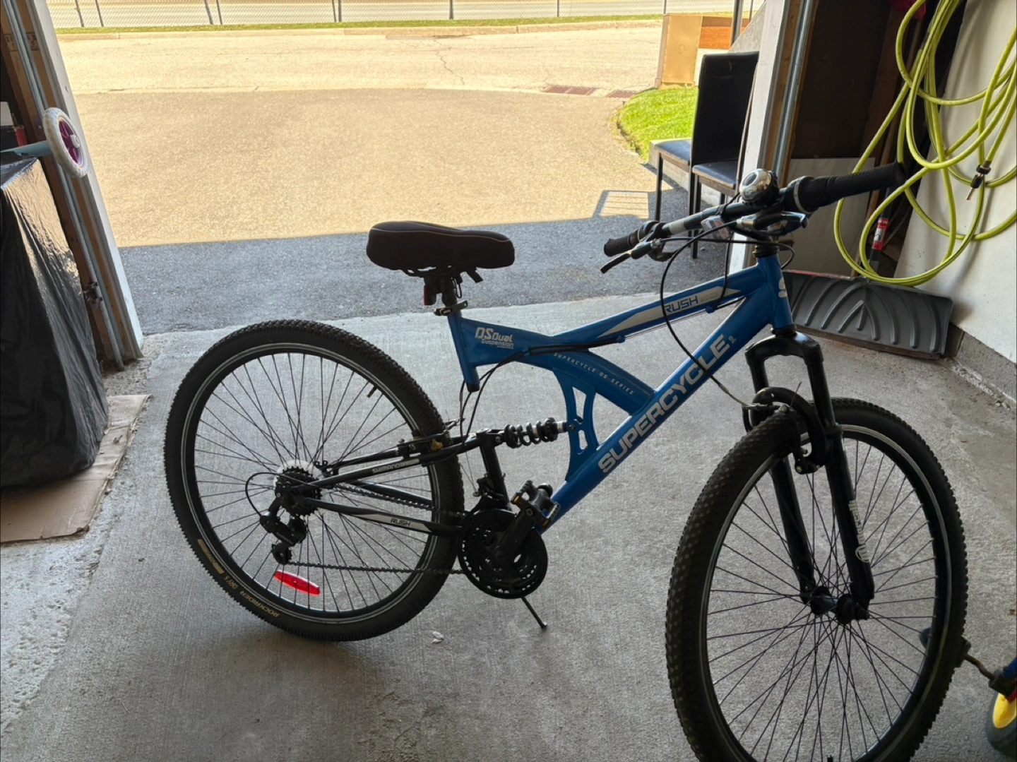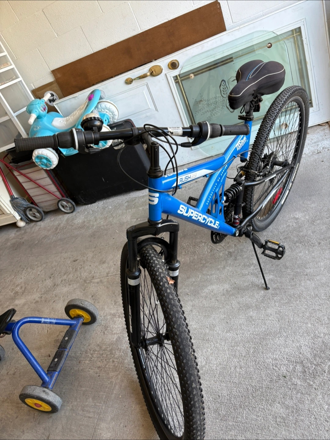 Blue Supercycle Rush mountain bike. 26-inch wheels.Good condition. Rarely used.