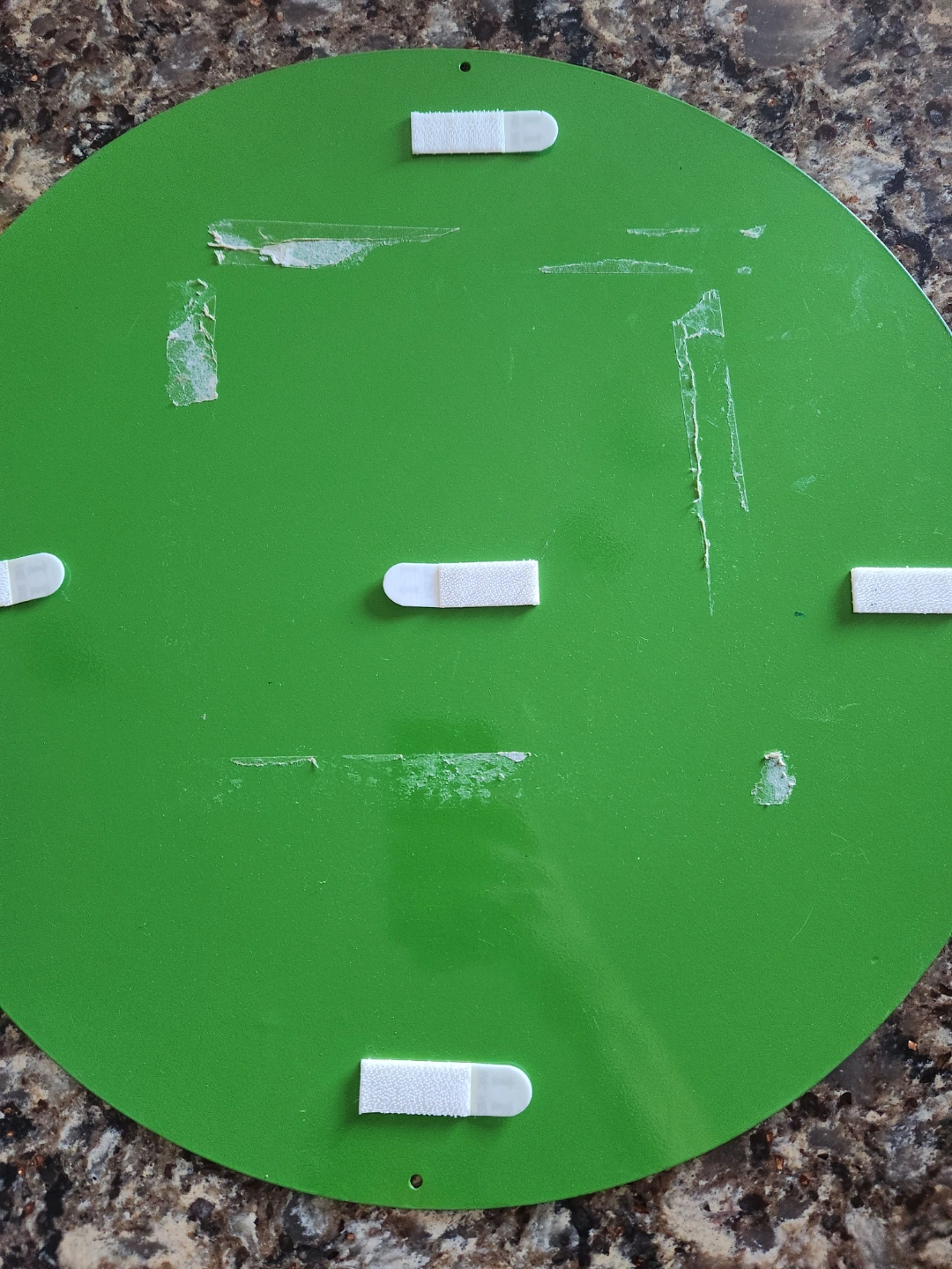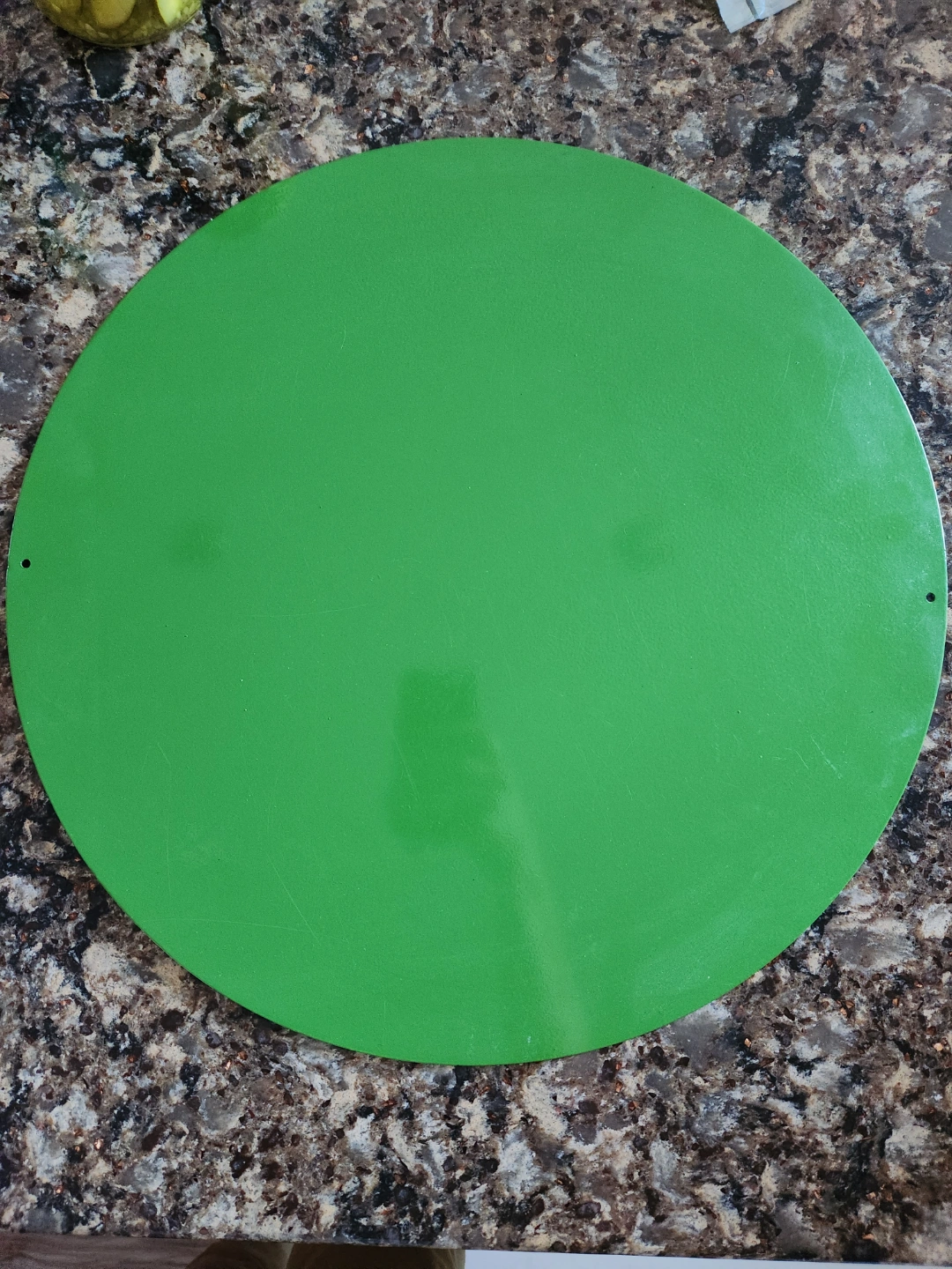 Round metal sign. Solid green color. Some adhesive residue on back that easily comes off. Has holes for hanging. Perfect for DIY projects or crafting. 16 inches from side to side