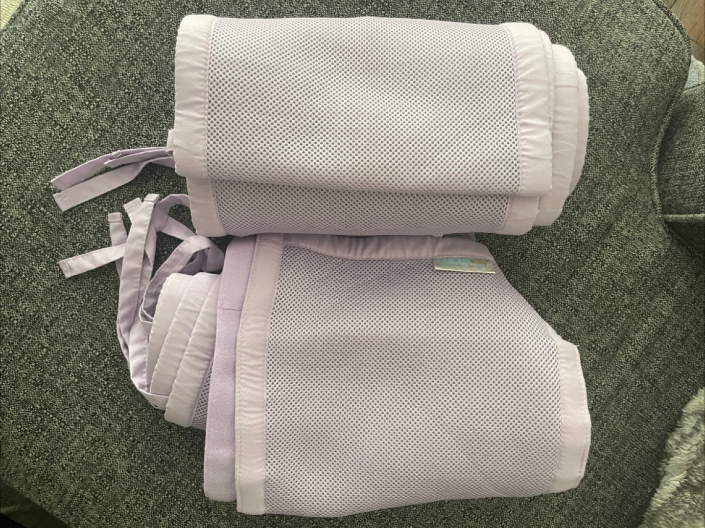 BreathableBaby Breathable Mesh Liner for Full-Size Cribs, Classic 3mm Mesh, Lavender (Size 4FS Covers 3 or 4 Sides). Set of two liners. Breathable mesh fabric. Attaches easily to crib rails. Gently used, excellent condition.