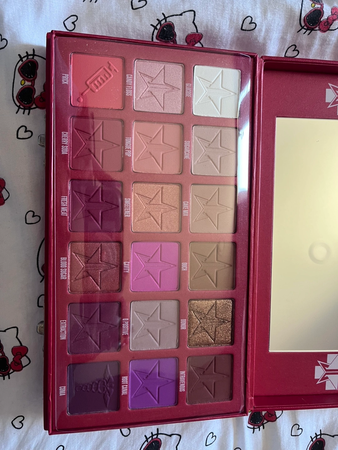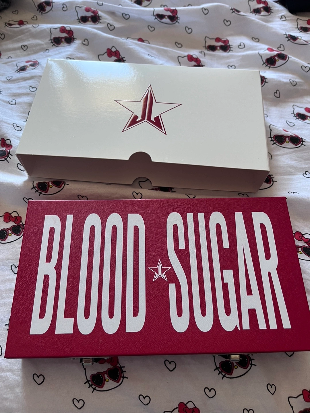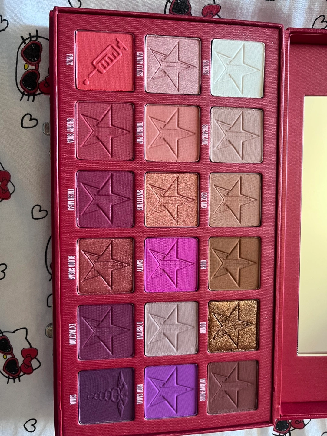 Brand new, sealed Jeffree Star Blood Sugar eyeshadow palette. Includes 18 shades. Red and maroon packaging. Never been used, just a collection item.