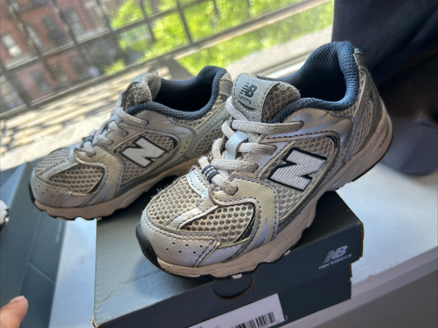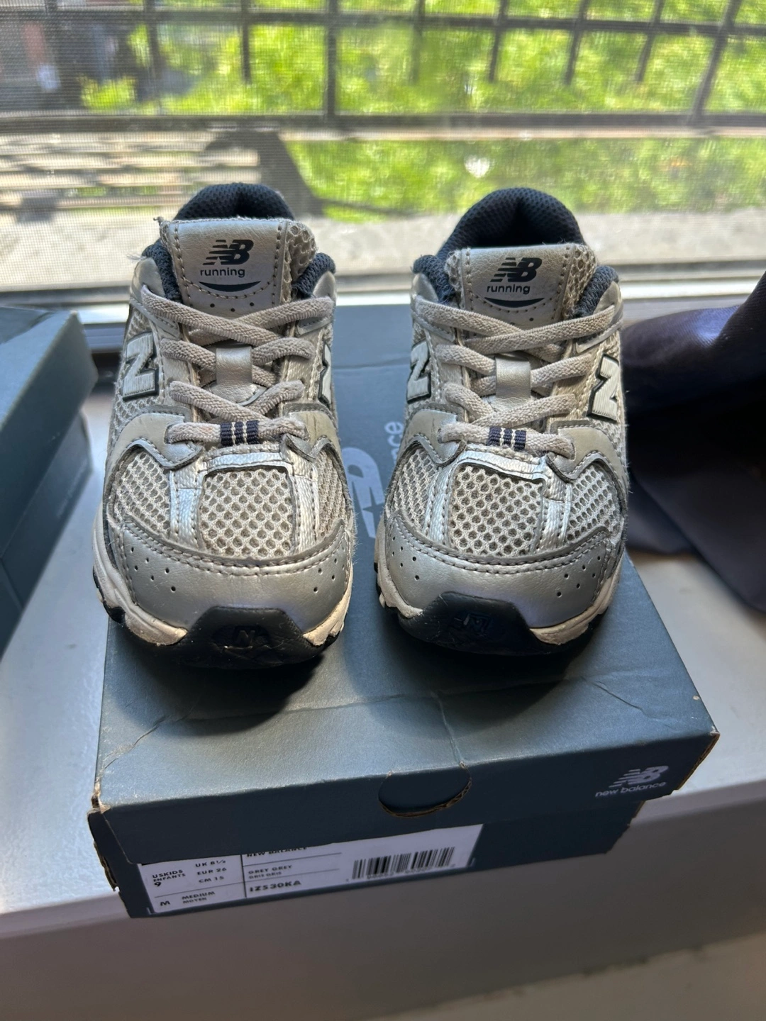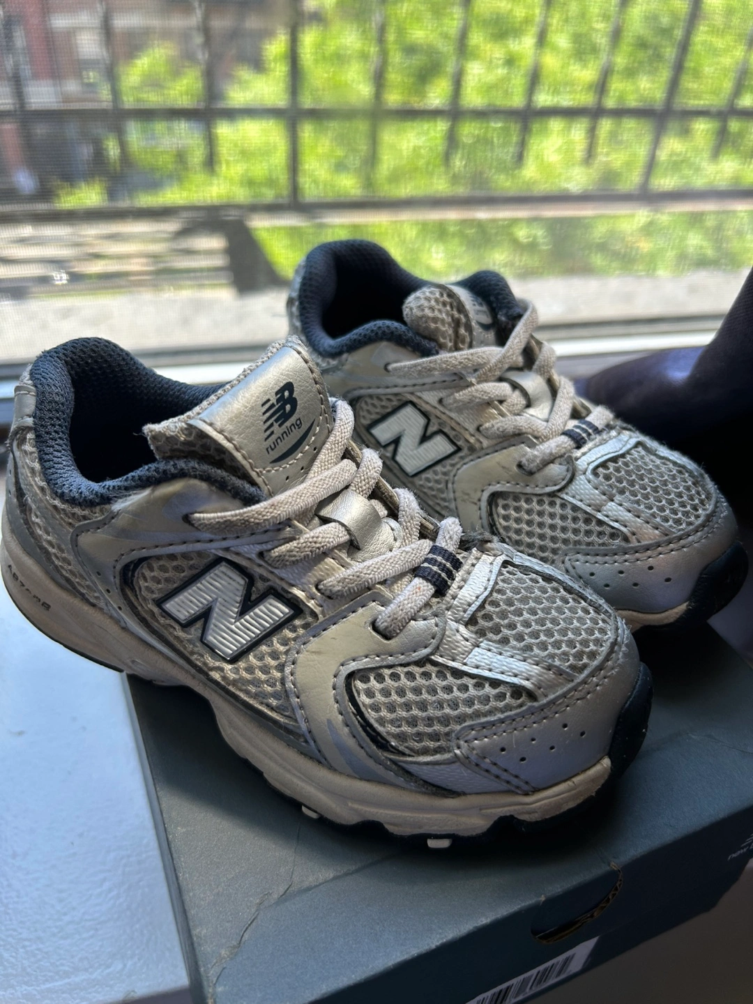 Infant/toddler New Balance 520 running shoes. Silver with black accents. Lace-up closure. Mesh and synthetic upper. Comes in original box. Size 9 #free-cycle 💚