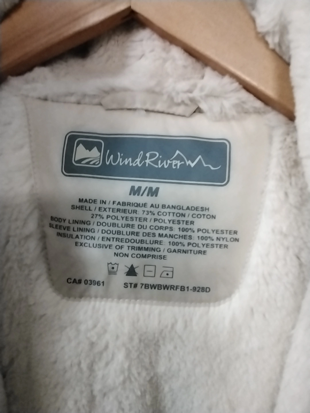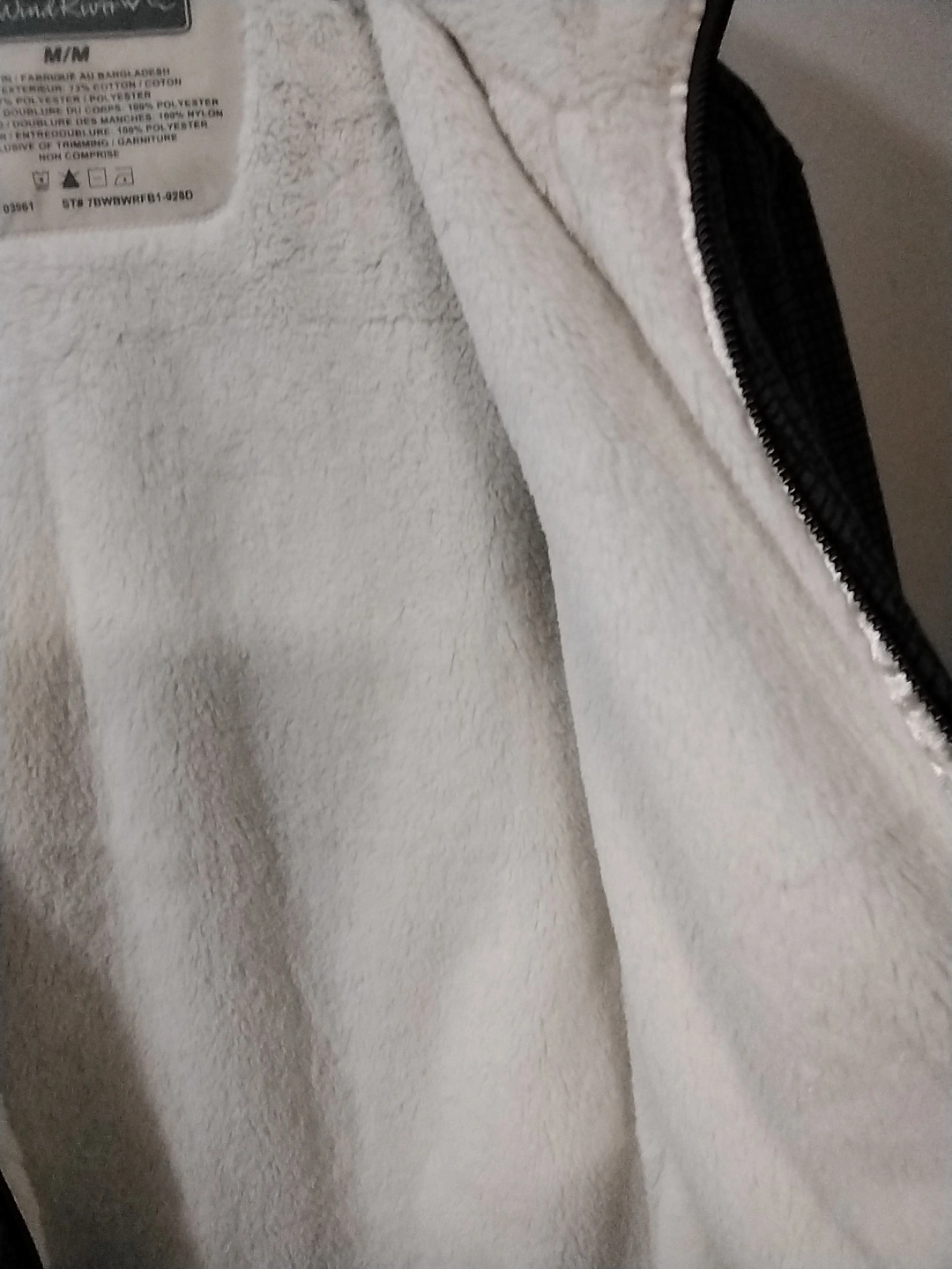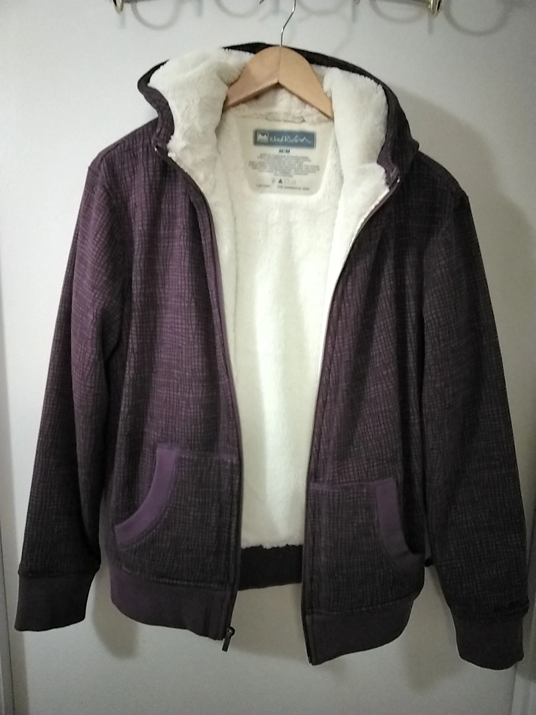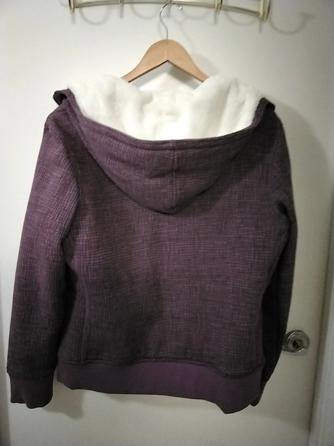 Women's size medium purple zip-up hoodie. Features a soft fleece lining. Made in Bangladesh. 73% cotton, 27% polyester shell. Polyester body lining and sleeve lining. 100% nylon insulation.