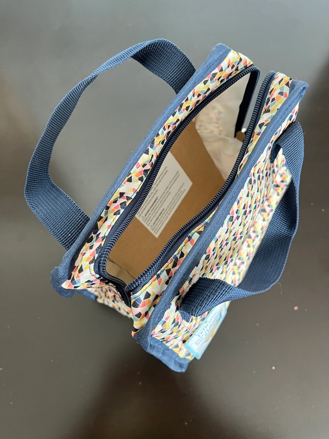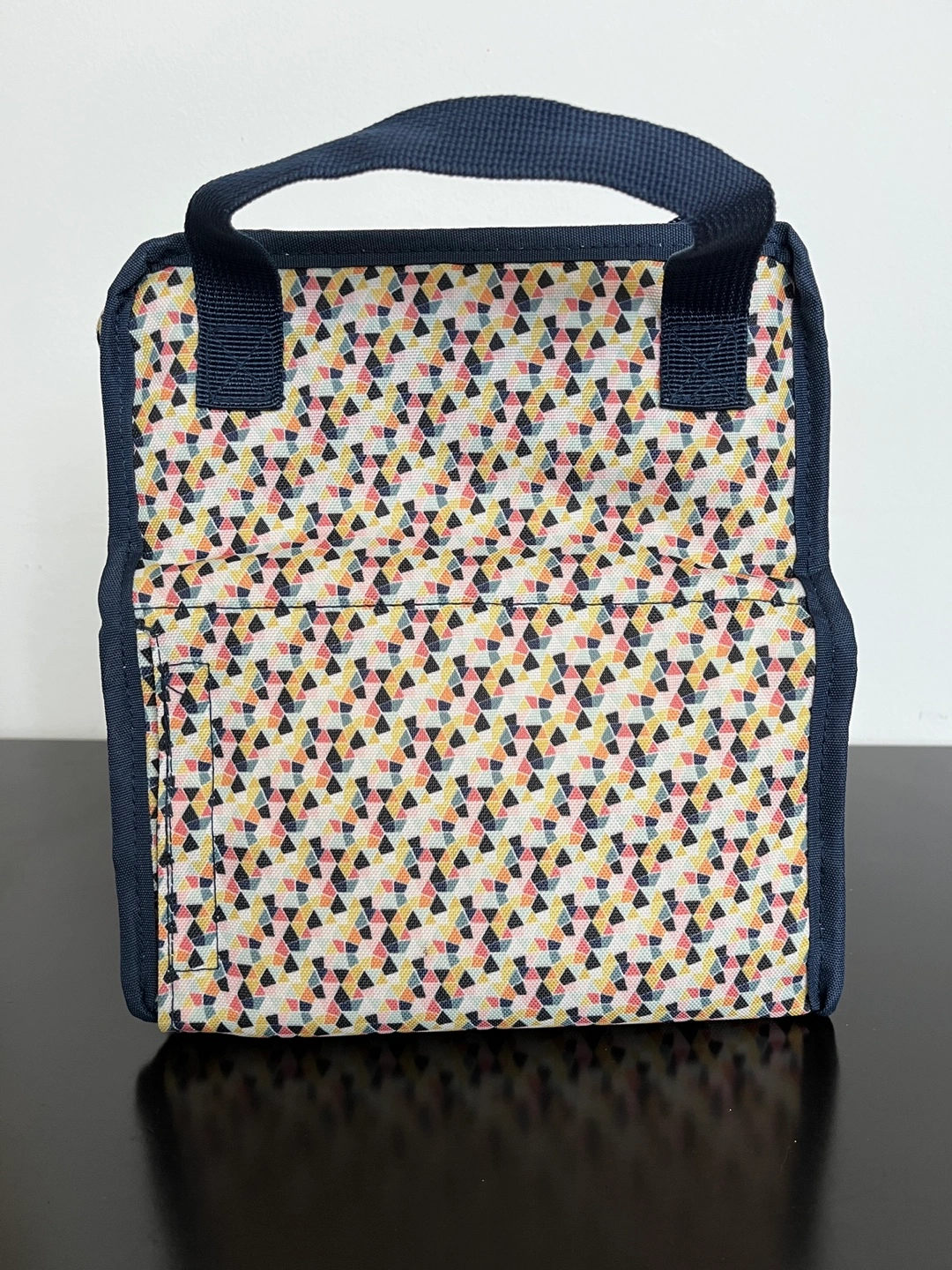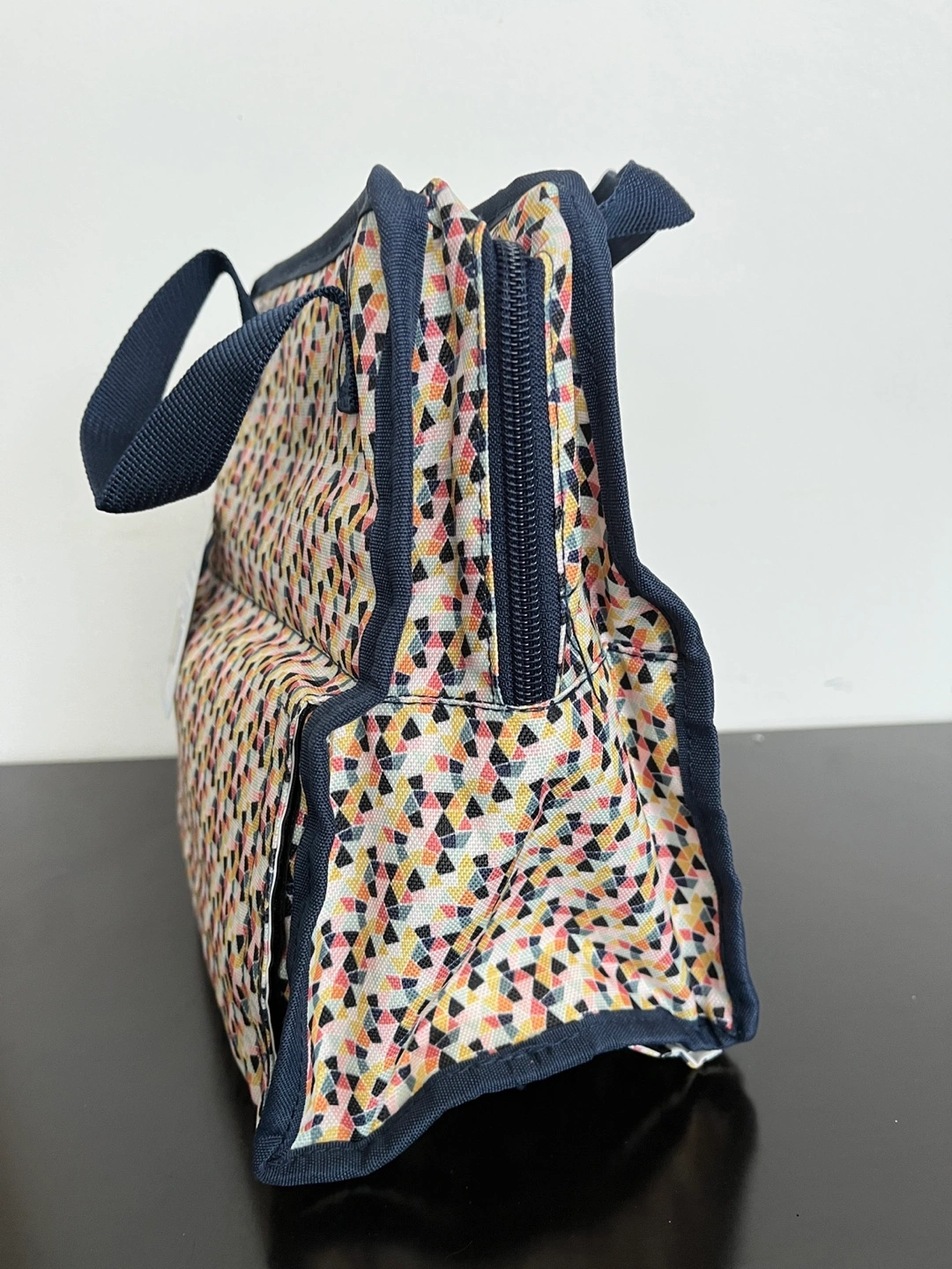 Cute and convenient reusable baby bottle bag. Features a zipper closure and a top handle. Multicoloured geometric pattern.