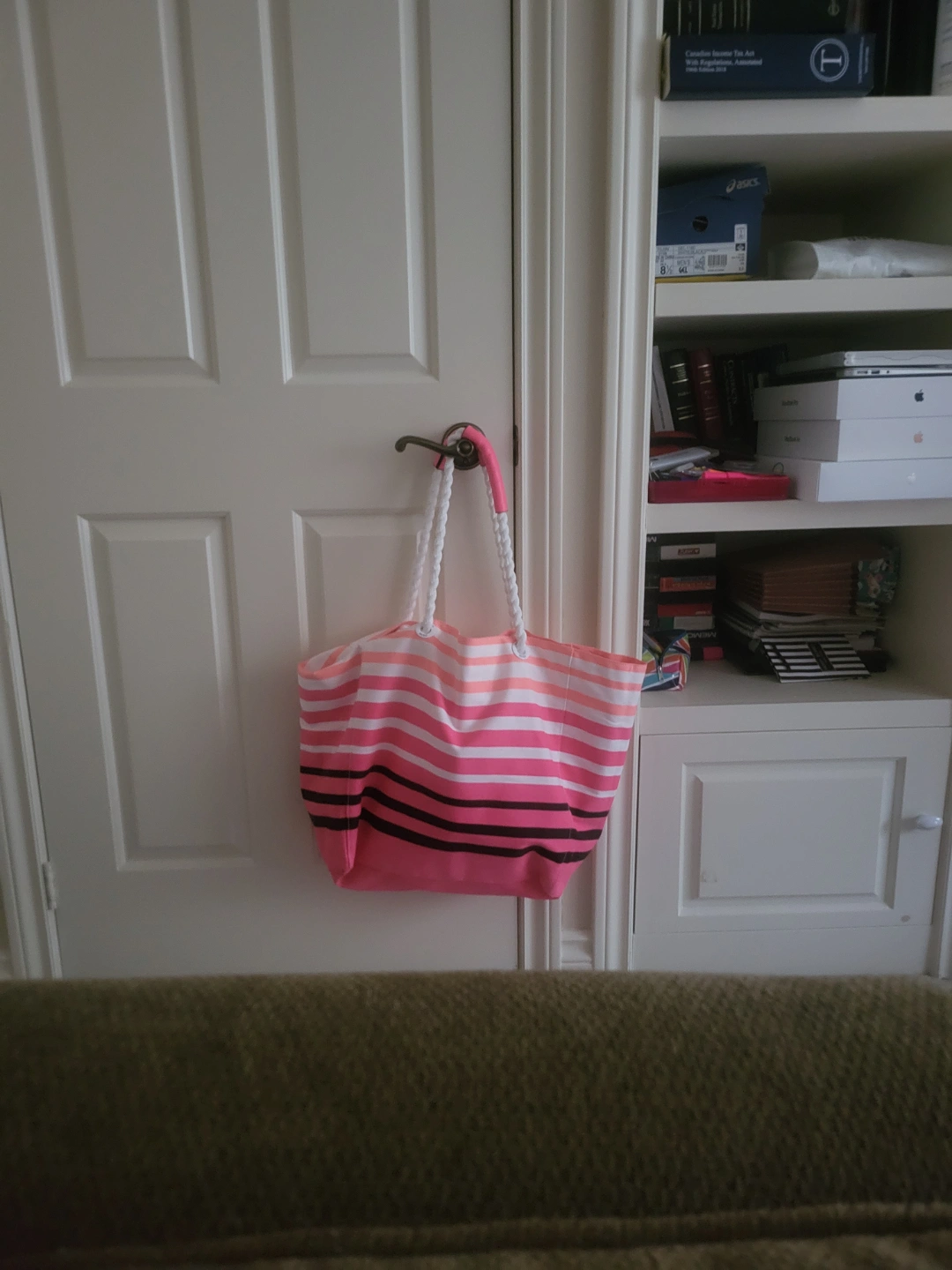 Large pink and white striped tote bag. Features rope handles. Perfect for the beach or everyday use.