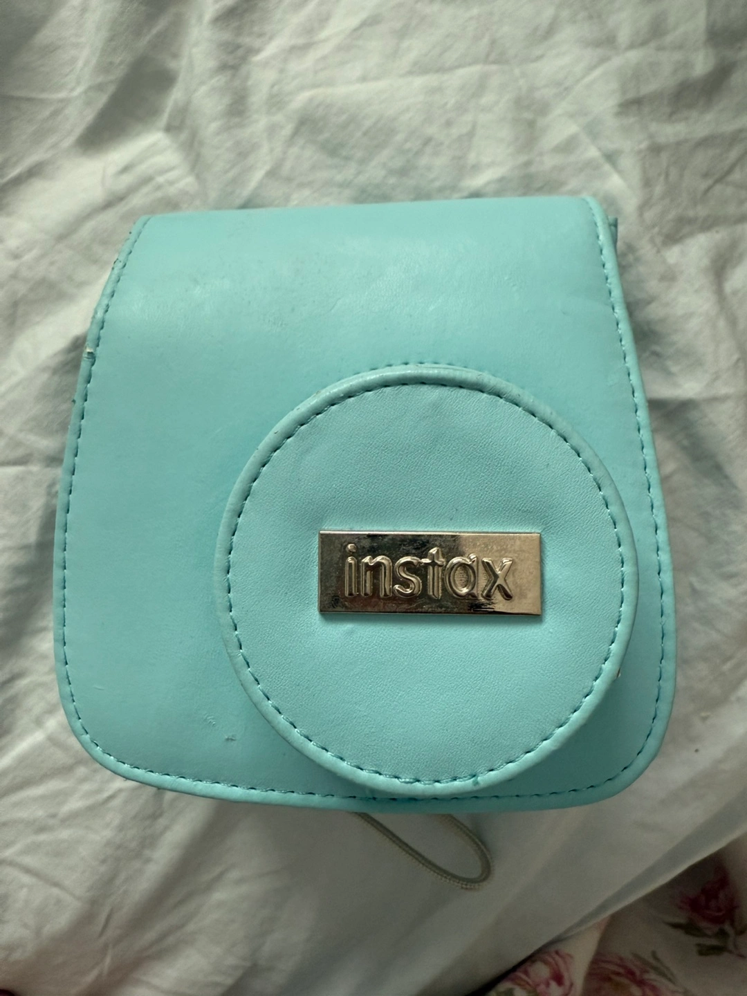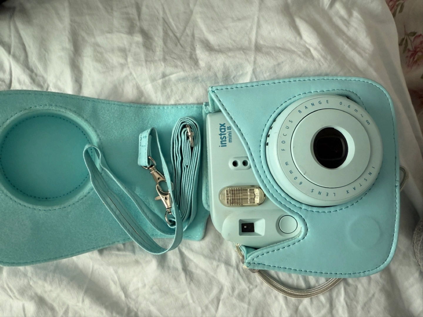 Light blue Instax Mini 8 instant camera. Includes a matching light blue carrying case with a shoulder strap. Perfect for capturing memories on the go.