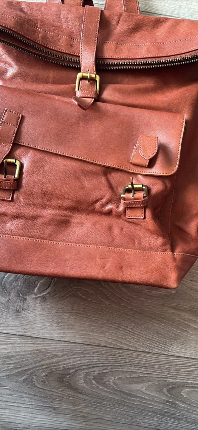 Large brown leather backpack. Features a roll-top closure and multiple buckles. Good for everyday use.