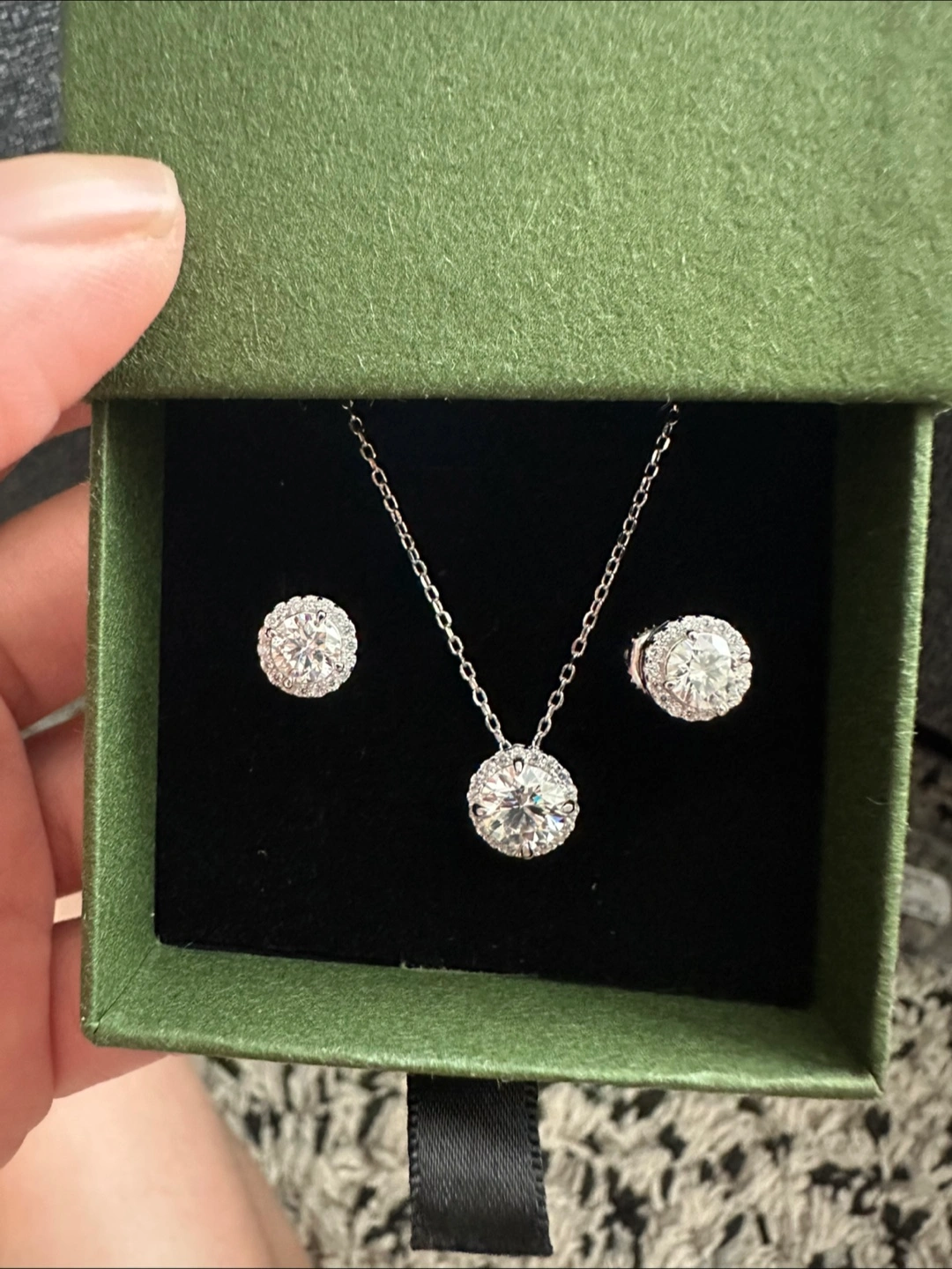 119Stunning moissanite jewellery set. Includes a delicate necklace and matching stud earrings. Comes with a certificate. Gold plating on 925silver Necklace $55 (1ct) Earring $60 (1ct=0.5ct*2) set $100