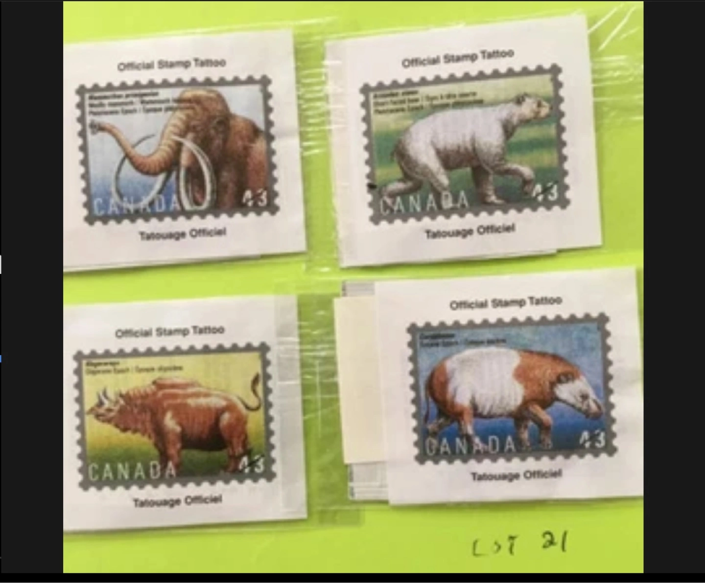 Set of four temporary tattoos used to promote the 1993 prehistoric animal stamp issued (4th issue in series). Each features a different extinct Canadian animal: mammoth, short-faced bear, eupceratops, and a tapir. Official stamp design. New, unused.