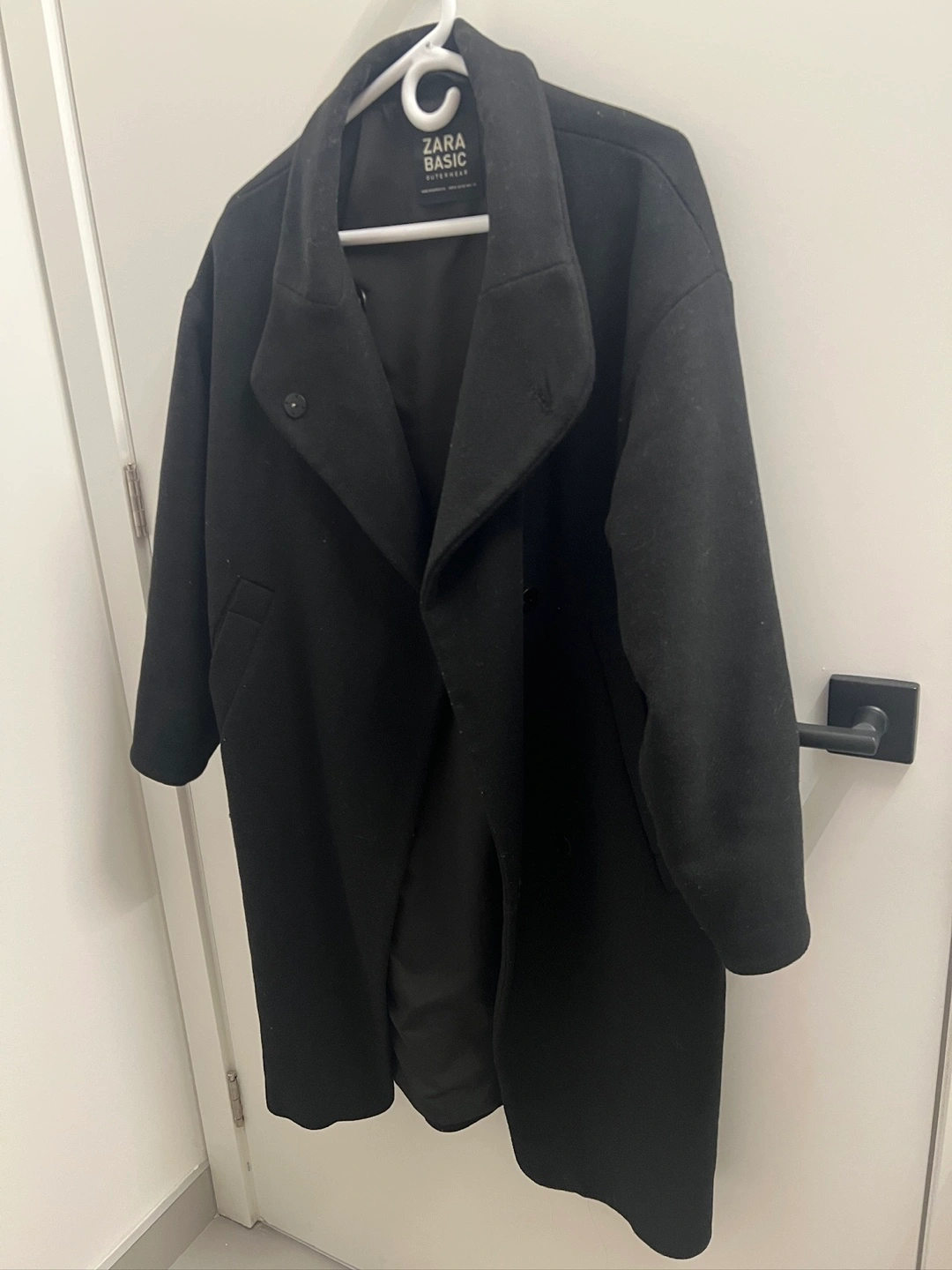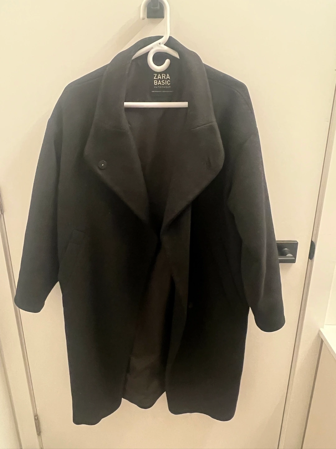 Long black wool coat. Relaxed fit. Asymmetrical closure. Pockets. Excellent for colder weather.