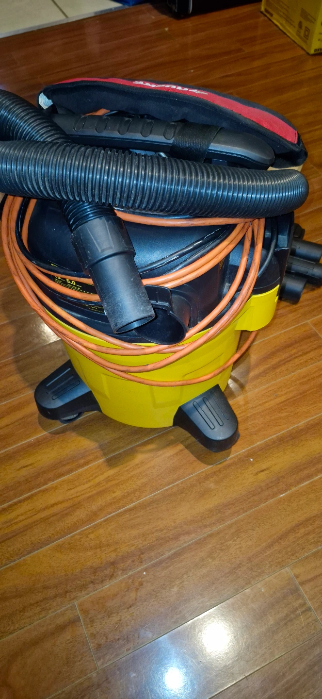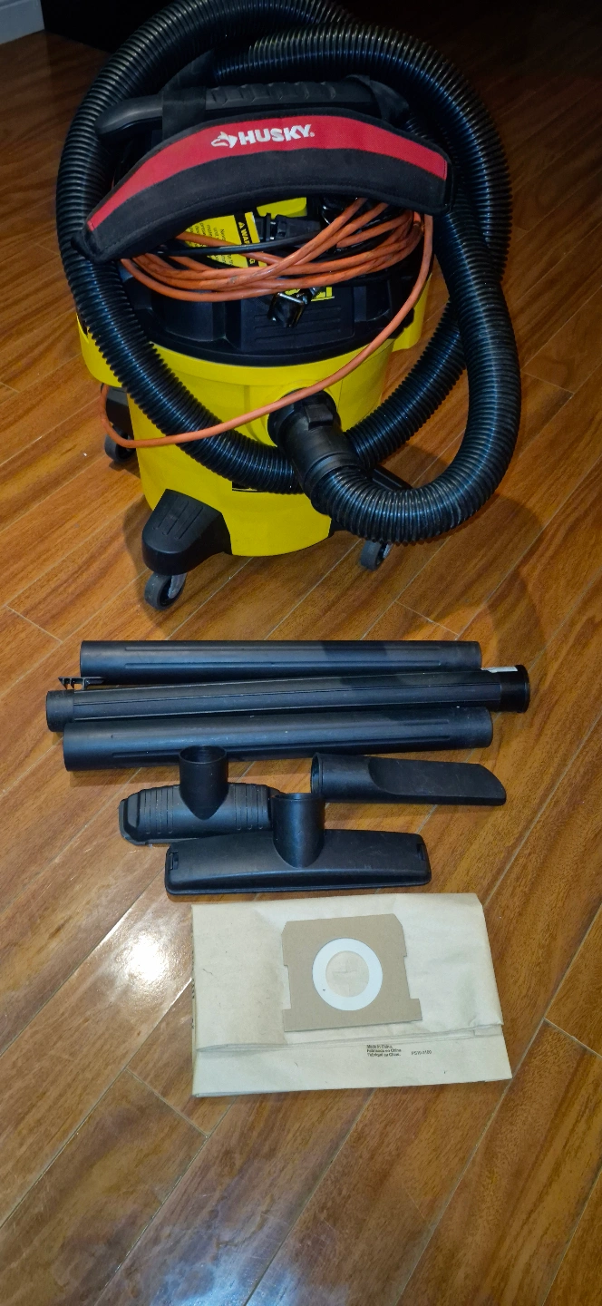 5-gallon portable wet/dry vacuum. 4 peak HP. Includes 8-piece accessory kit. Good condition. Paper filter bag included. I've had it a year, it's been used very little. In very good condition. Includes a new bag and one that is already in the vacuum cleaner. Includes an extension cord and a carrying strap