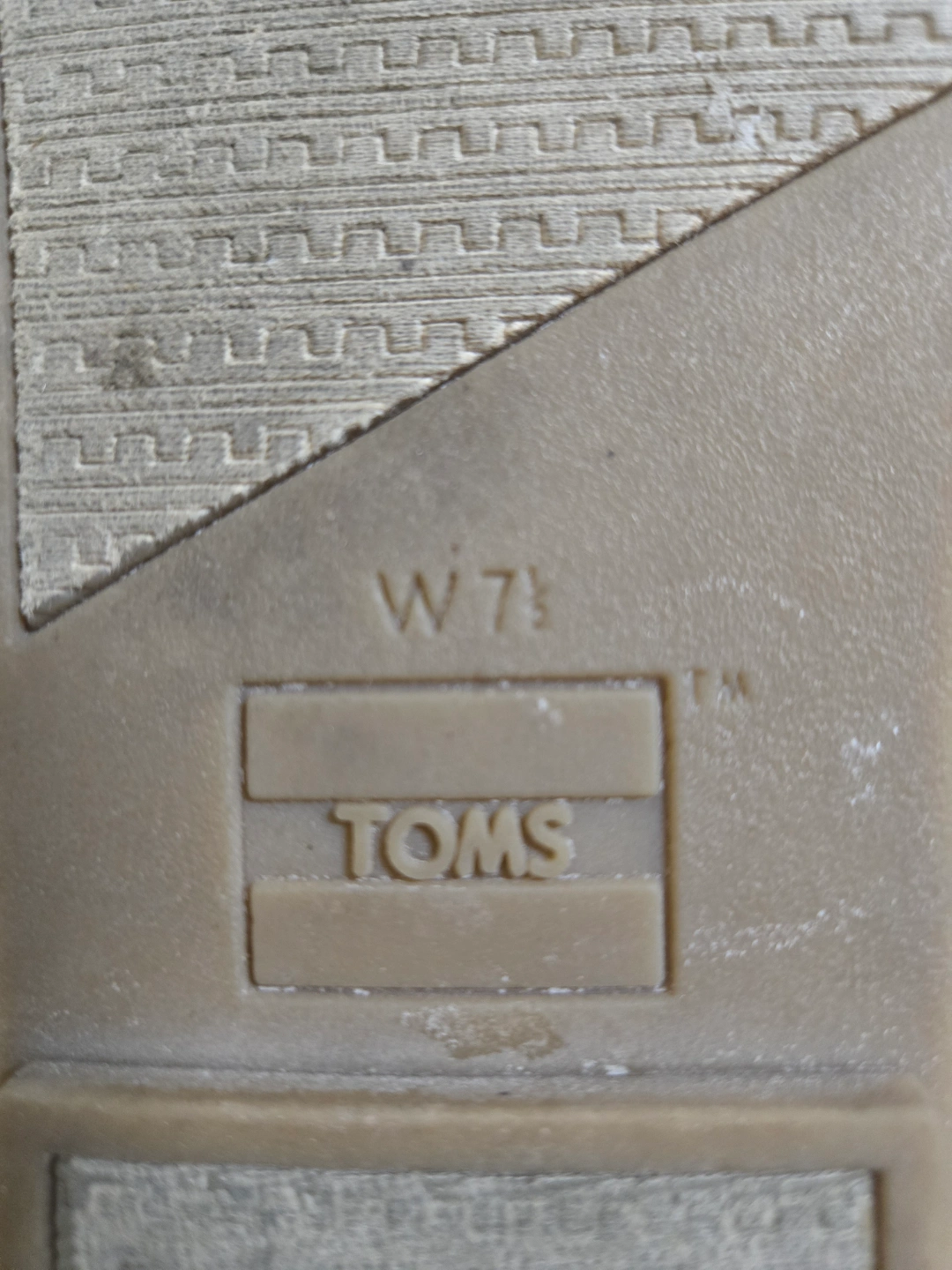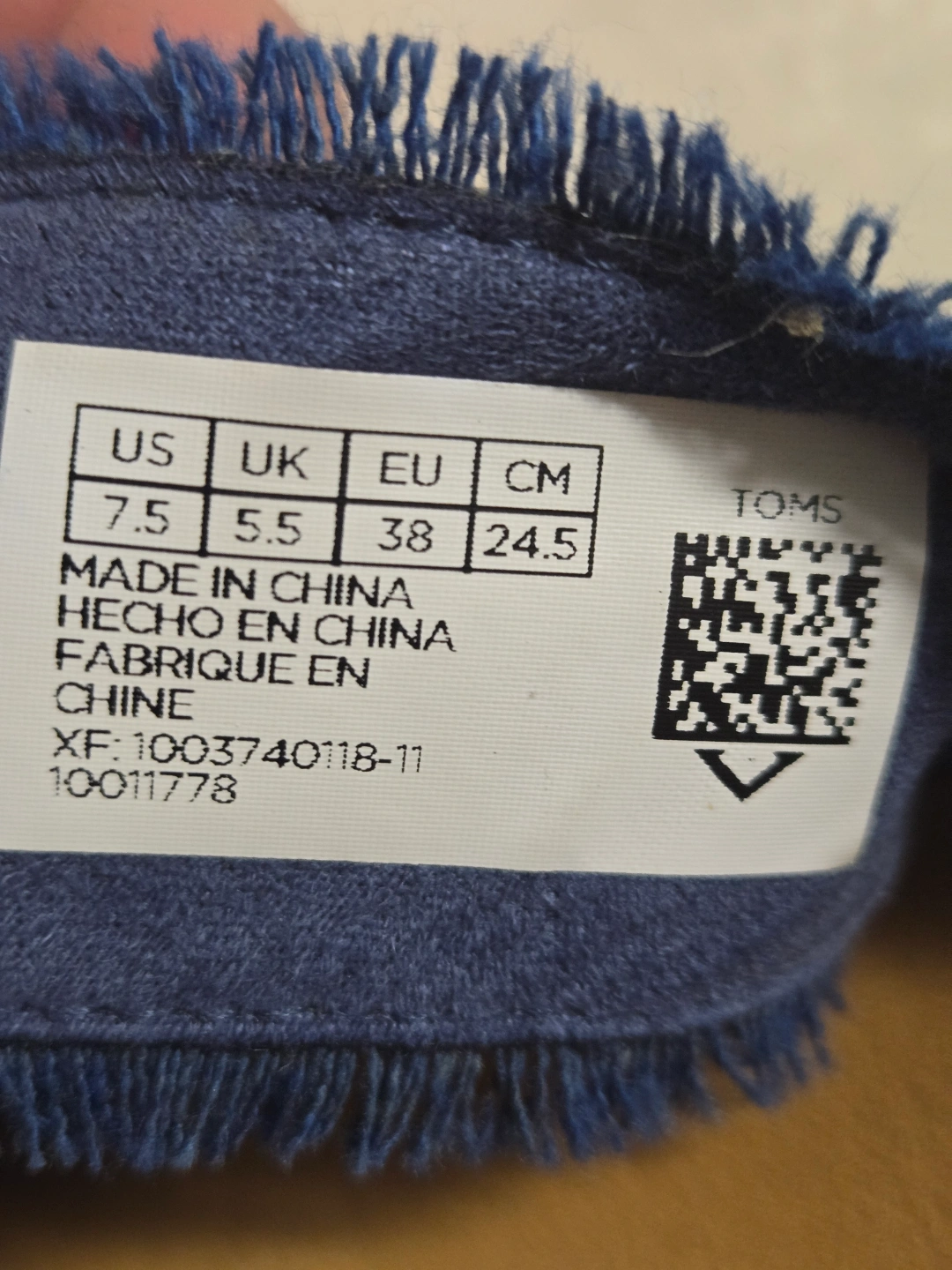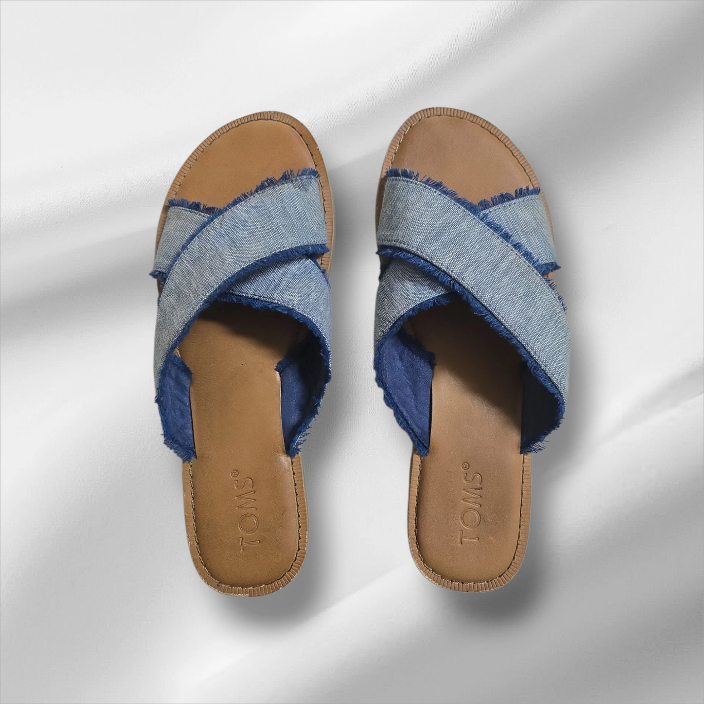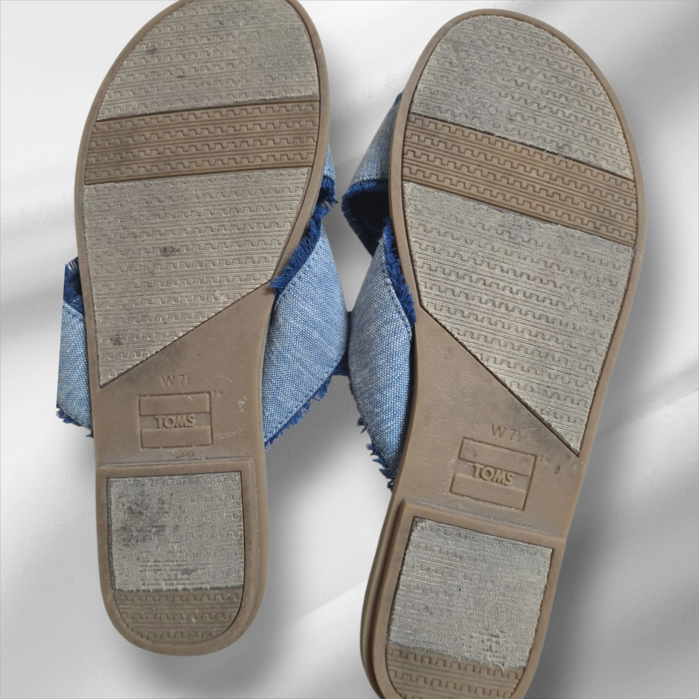 Women's TOMS slides. Denim upper, tan sole. Size 7.5, US sizing. Cross-strap design. Lightly used.