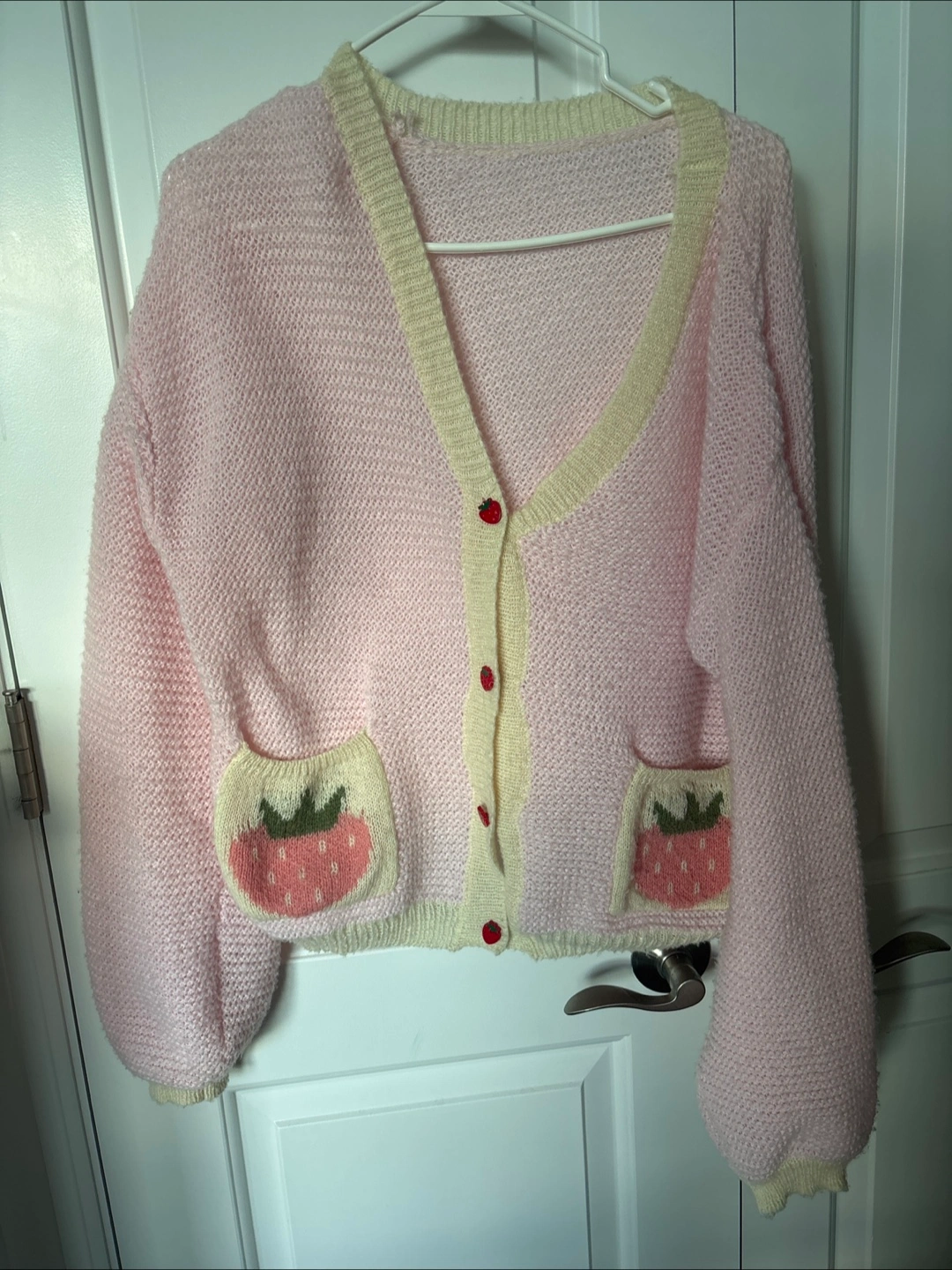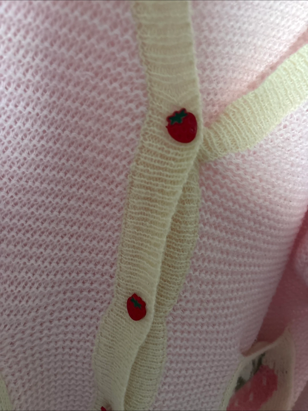 Pink knit cardigan. Features strawberry accents on pockets and buttons. Cream colored trim. Size XS.