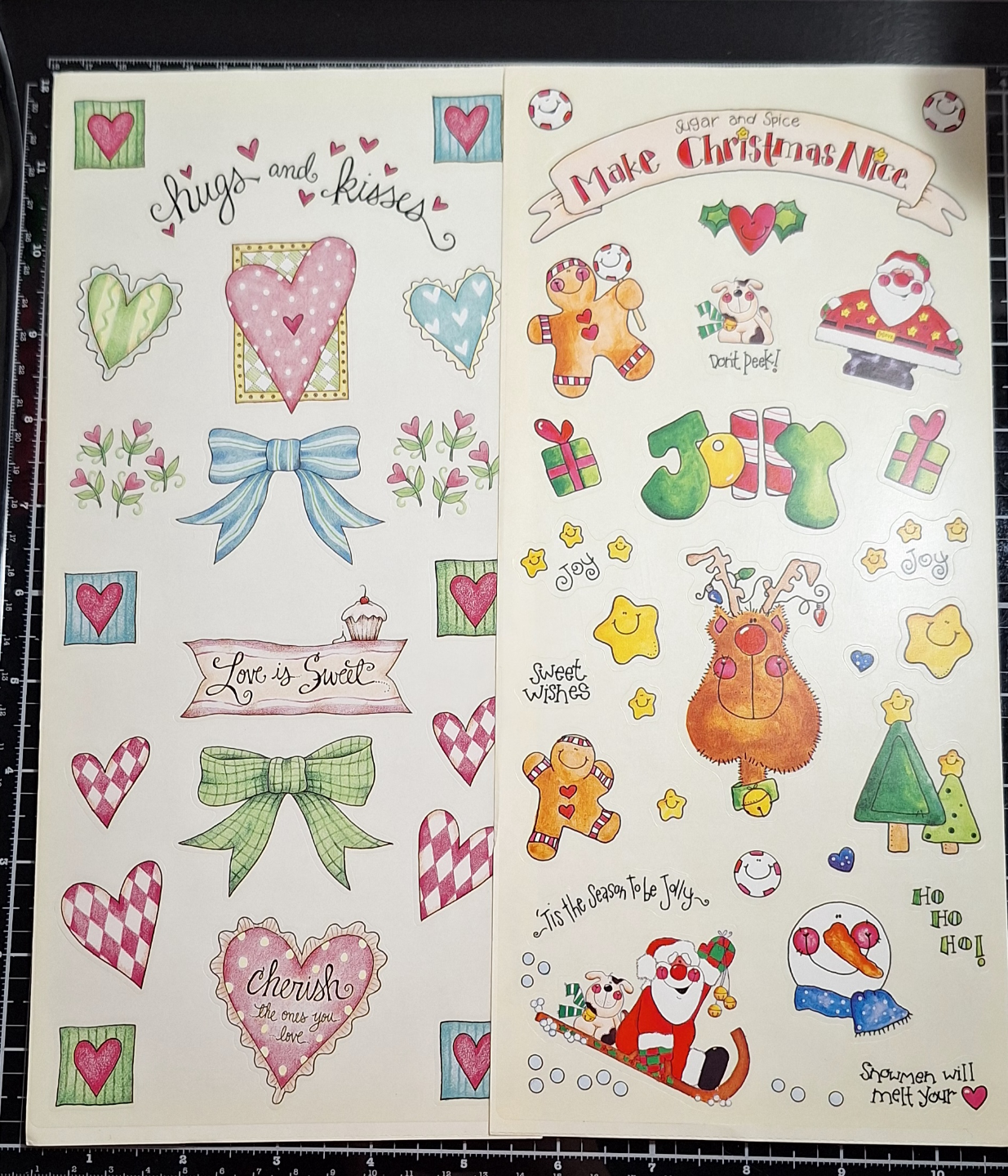 Two sticker sheets. One features hearts, bows, and romantic phrases. The other features Christmas-themed images, including Santa, a reindeer, and gingerbread people. Great for scrapbooking or crafting projects.
