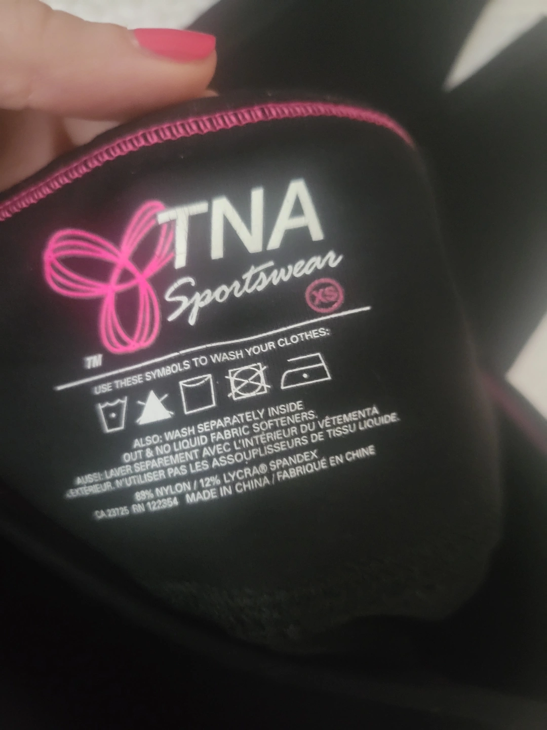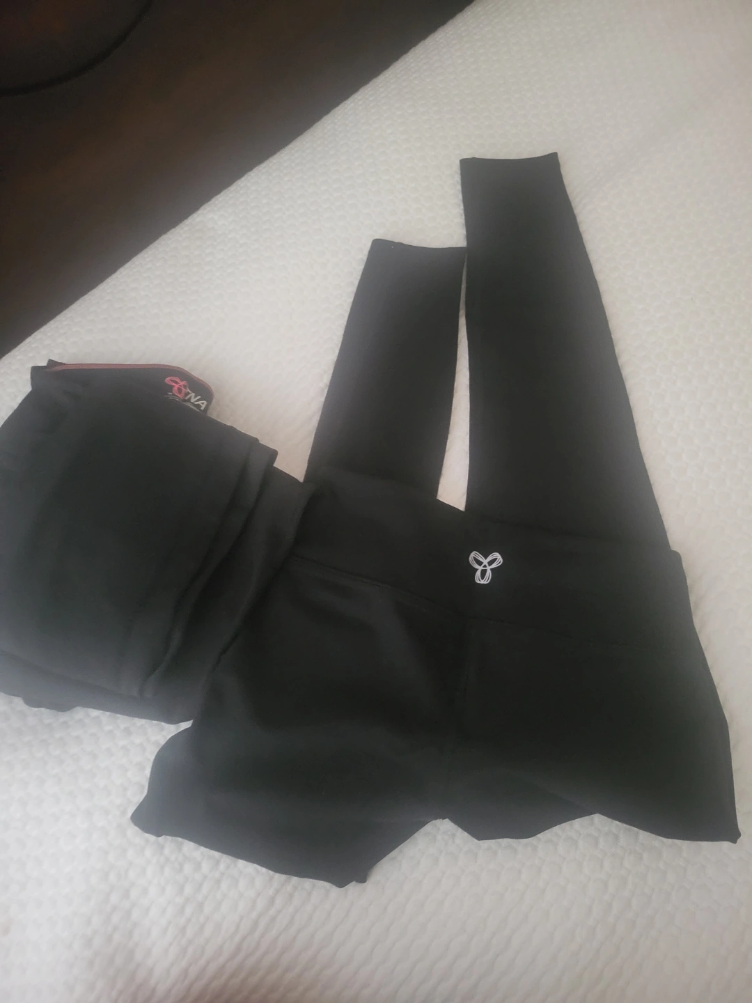 28Black leggings, size extra small. Excellent for workouts. Made of 88% nylon and 12% Lycra spandex. Machine wash separately inside out, no liquid fabric softener.