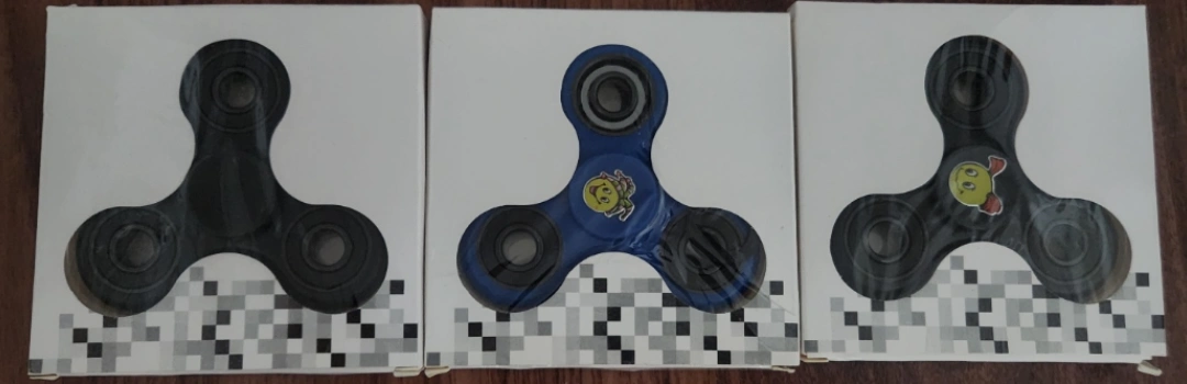 Set of three brand new fidget spinners. Two black and one blue. Each in its own box. Perfect for gifts or personal use.