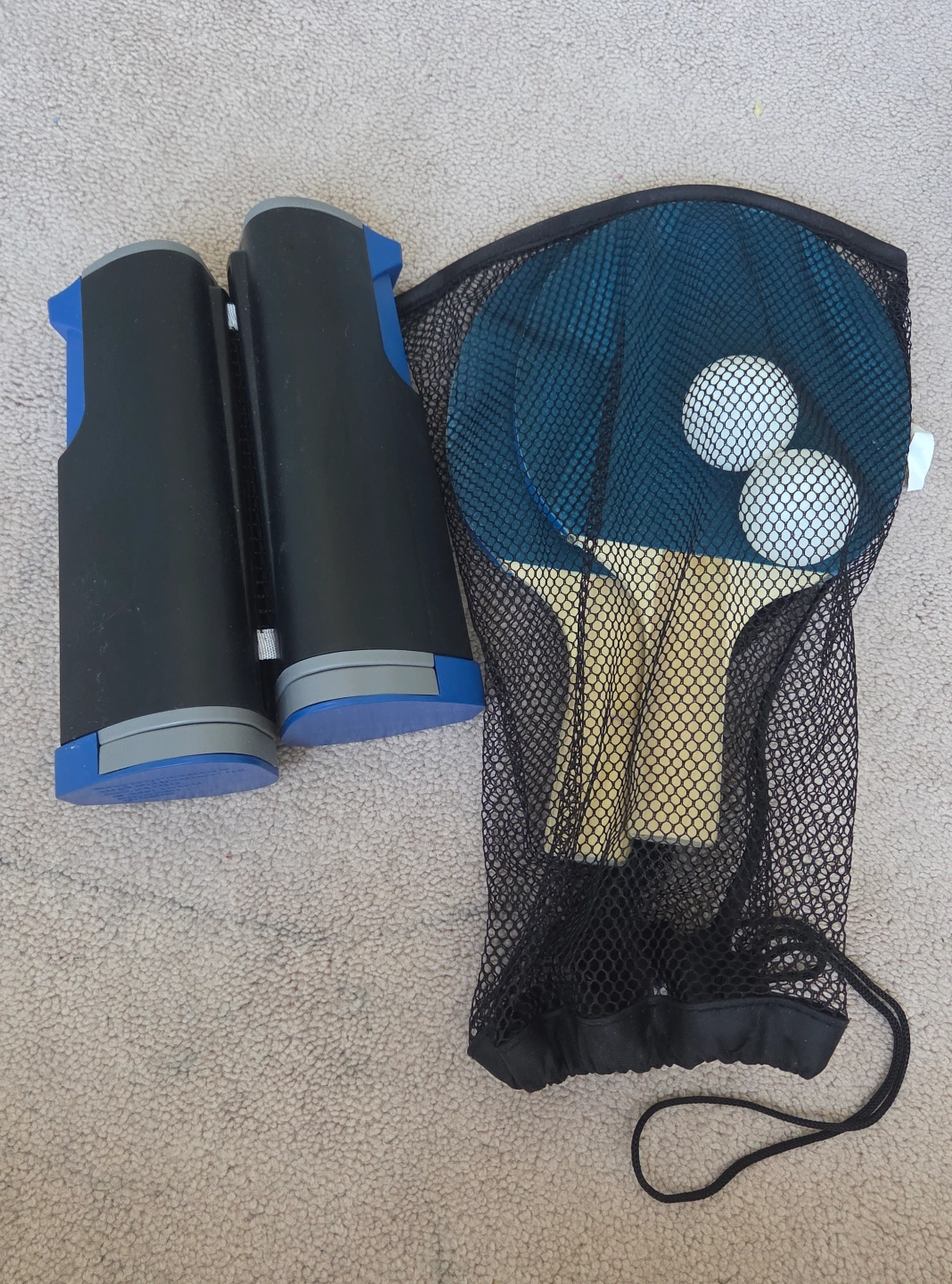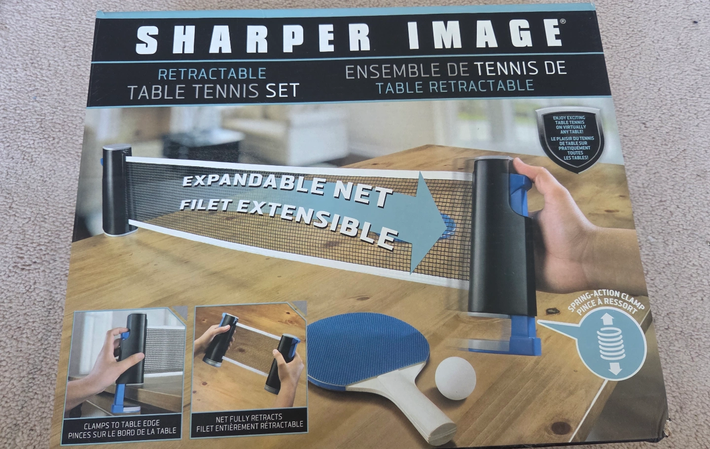 94Retractable table tennis set. Includes net, two paddles, and two balls. Expandable net, clamps to table edge. Net fully retracts. Spring-action clamp.