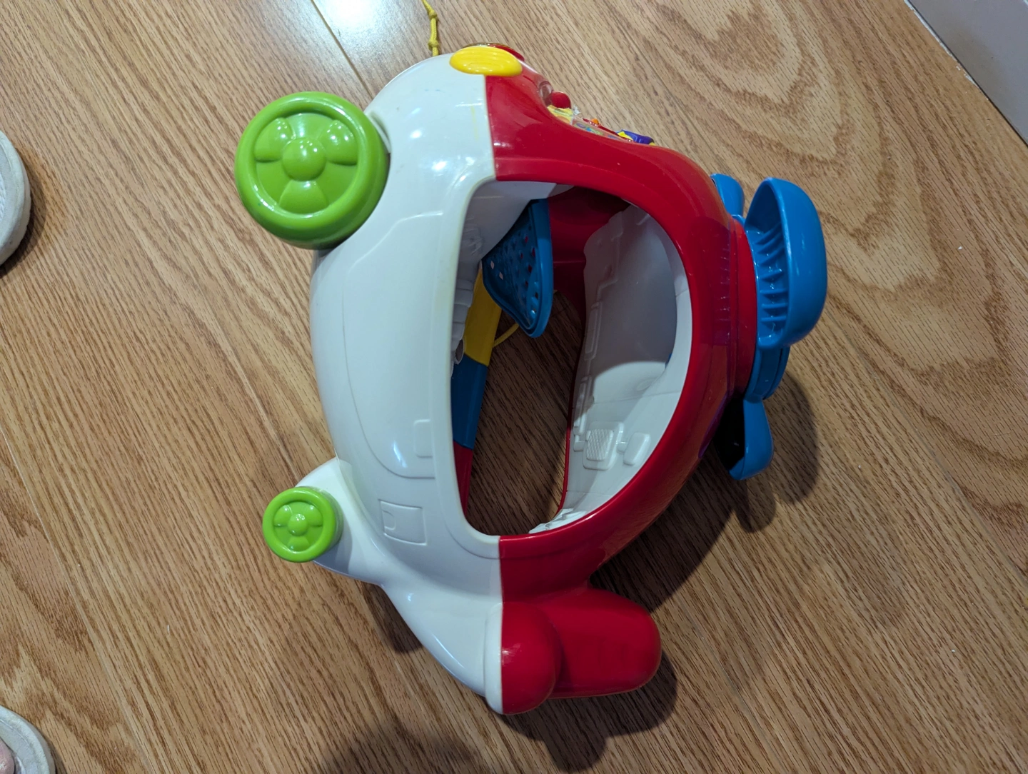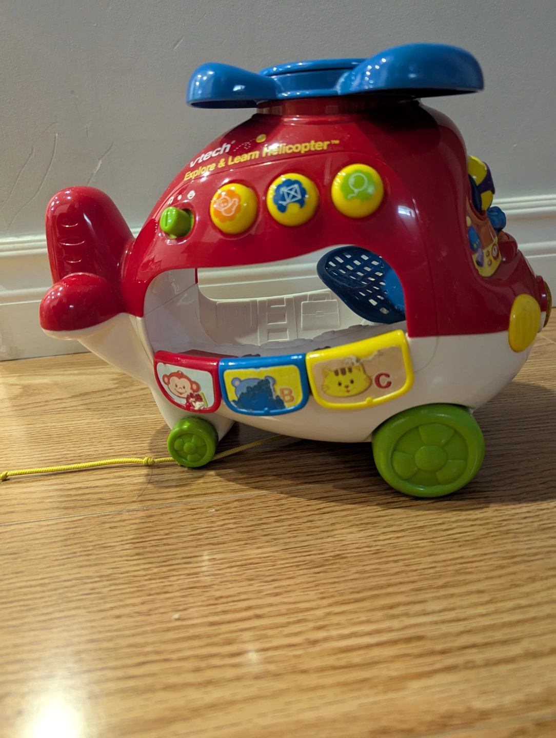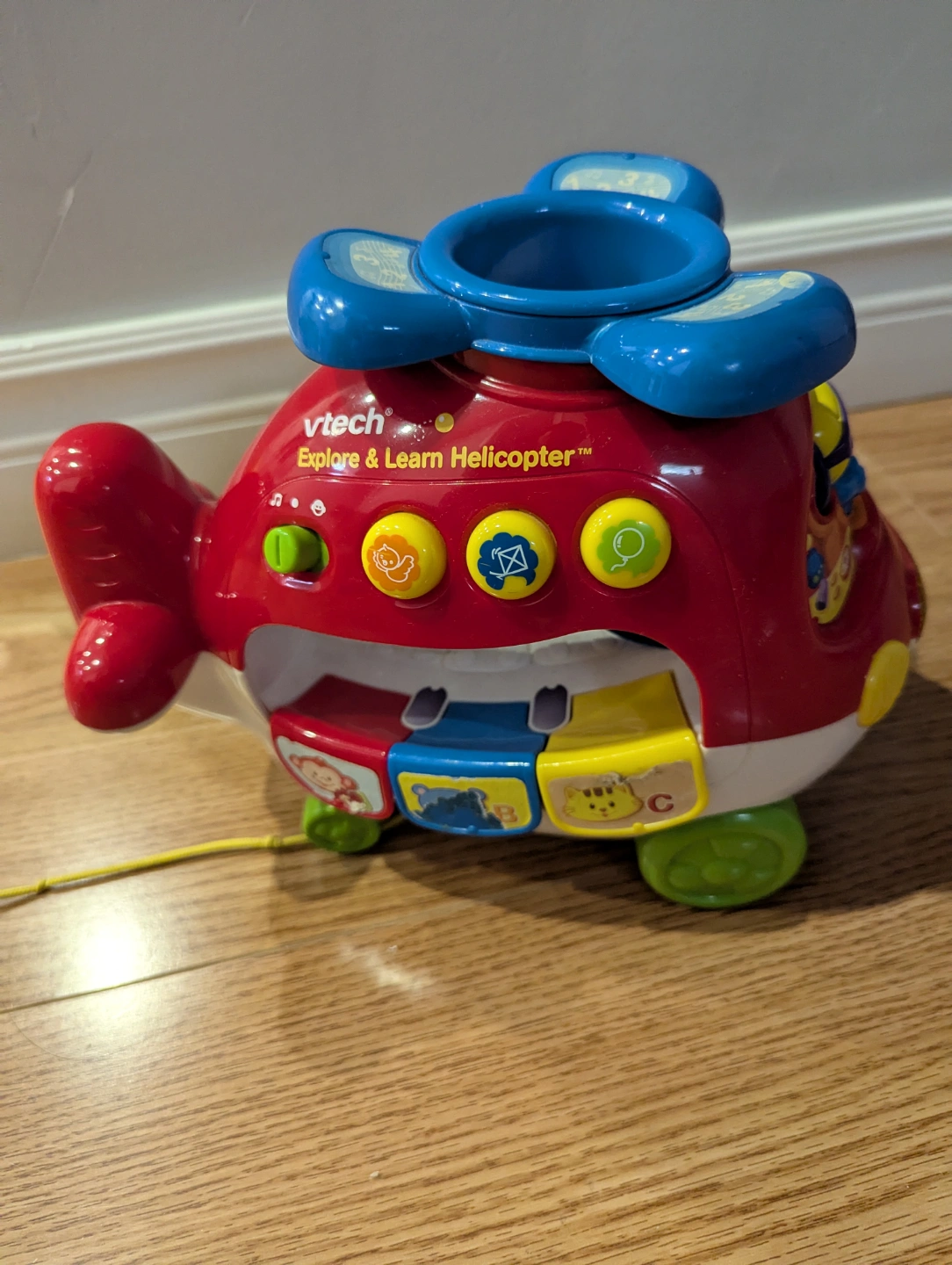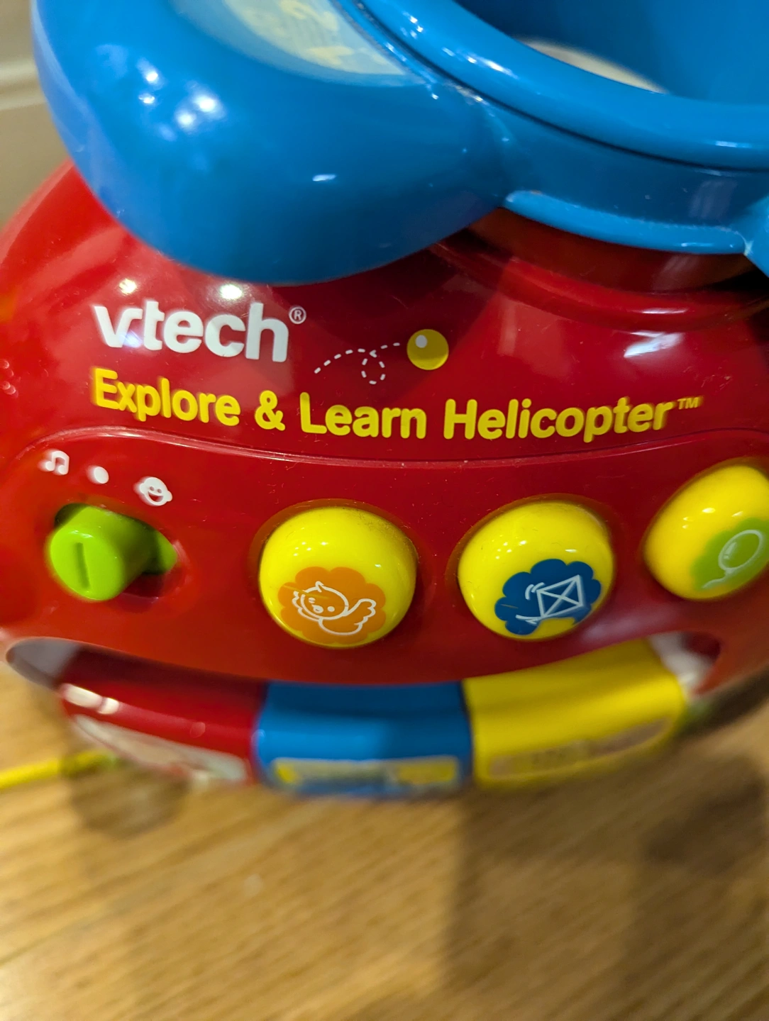 Pre-owned VTech Explore & Learn Helicopter. Interactive toy features lights and sounds. Ideal for toddlers. Pull-along design. Includes various buttons and activities.