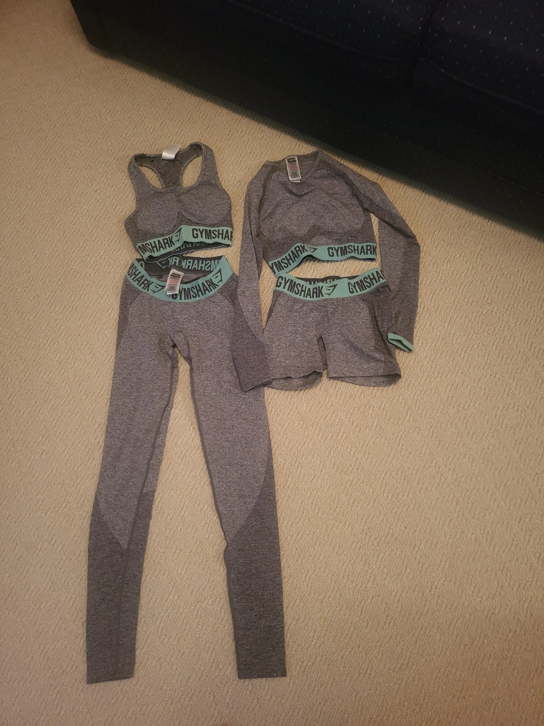 Gymshark seamless workout set. Includes sports bra, long-sleeve crop top, and leggings. Grey marl colour. Size extra small. Excellent for the gym or casual wear.