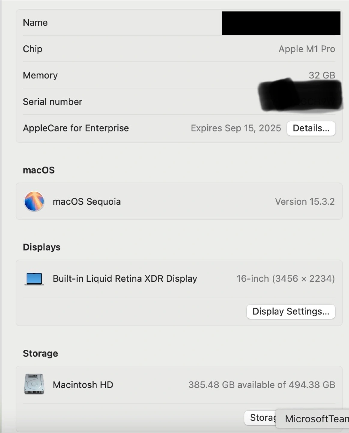 Apple MacBook Pro. 16-inch Liquid Retina XDR display. Apple M1 Pro chip. 32 GB unified memory. 500 GB SSD storage.AppleCare for Enterprise until September 15, 2025.