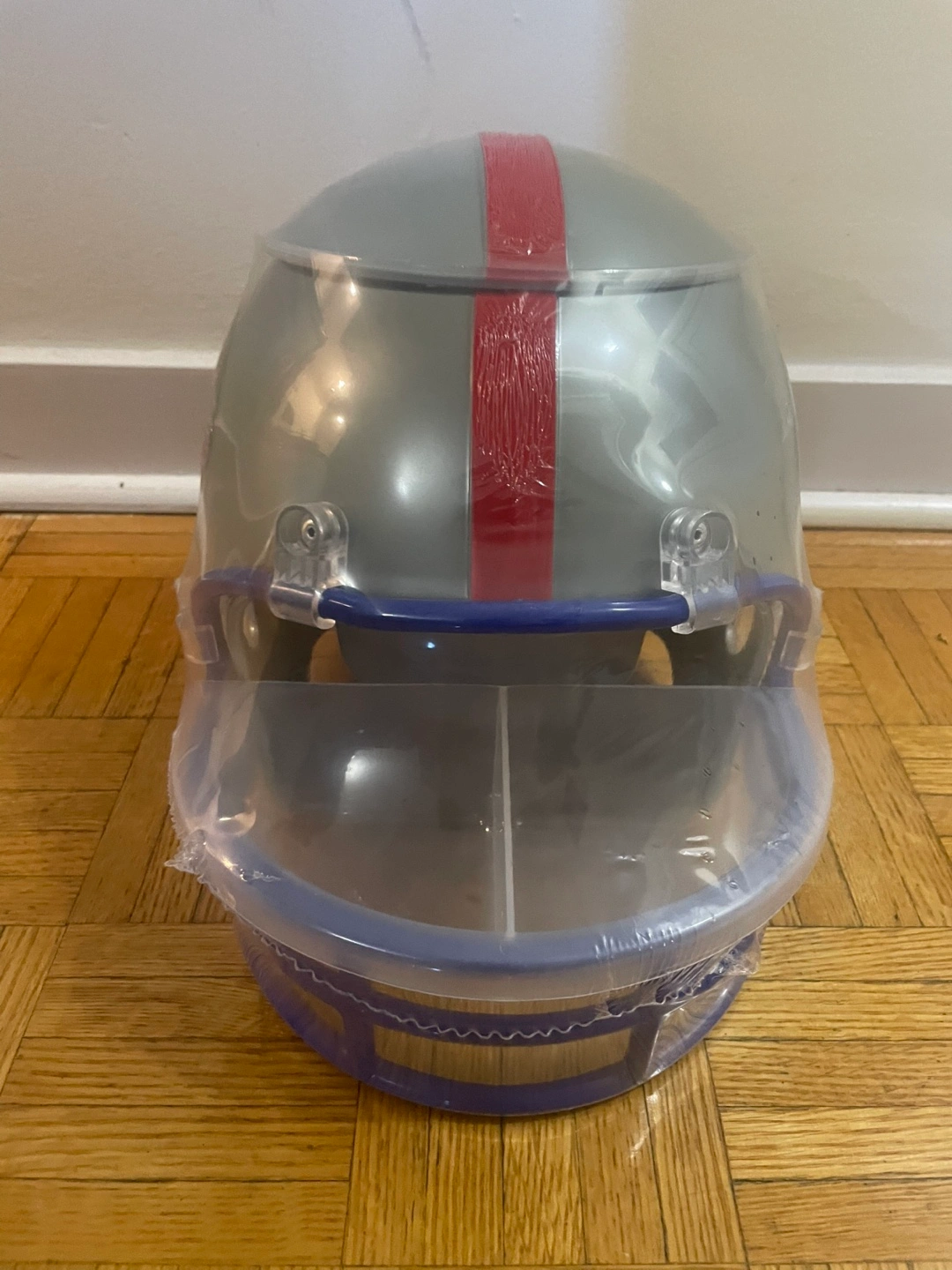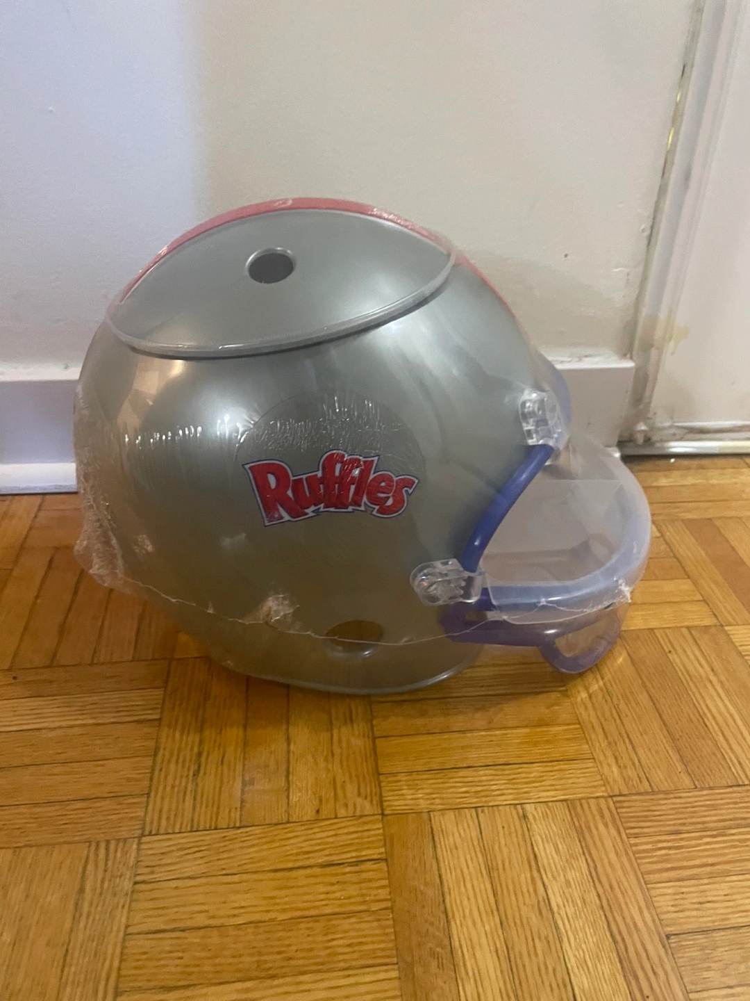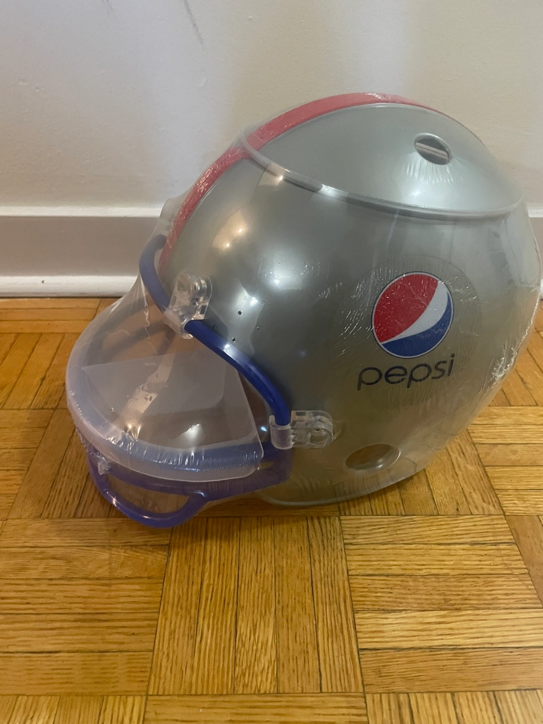 Two vintage promotional football helmet coolers. Silver with red and blue accents. One features the Pepsi logo, the other Ruffles. New, still in plastic wrap. For chips and dip