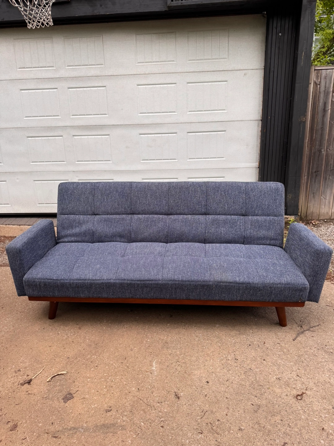 Comfortable futon couch. Dark bluish grey fabric. Wooden legs. Pull-out sofa bed.