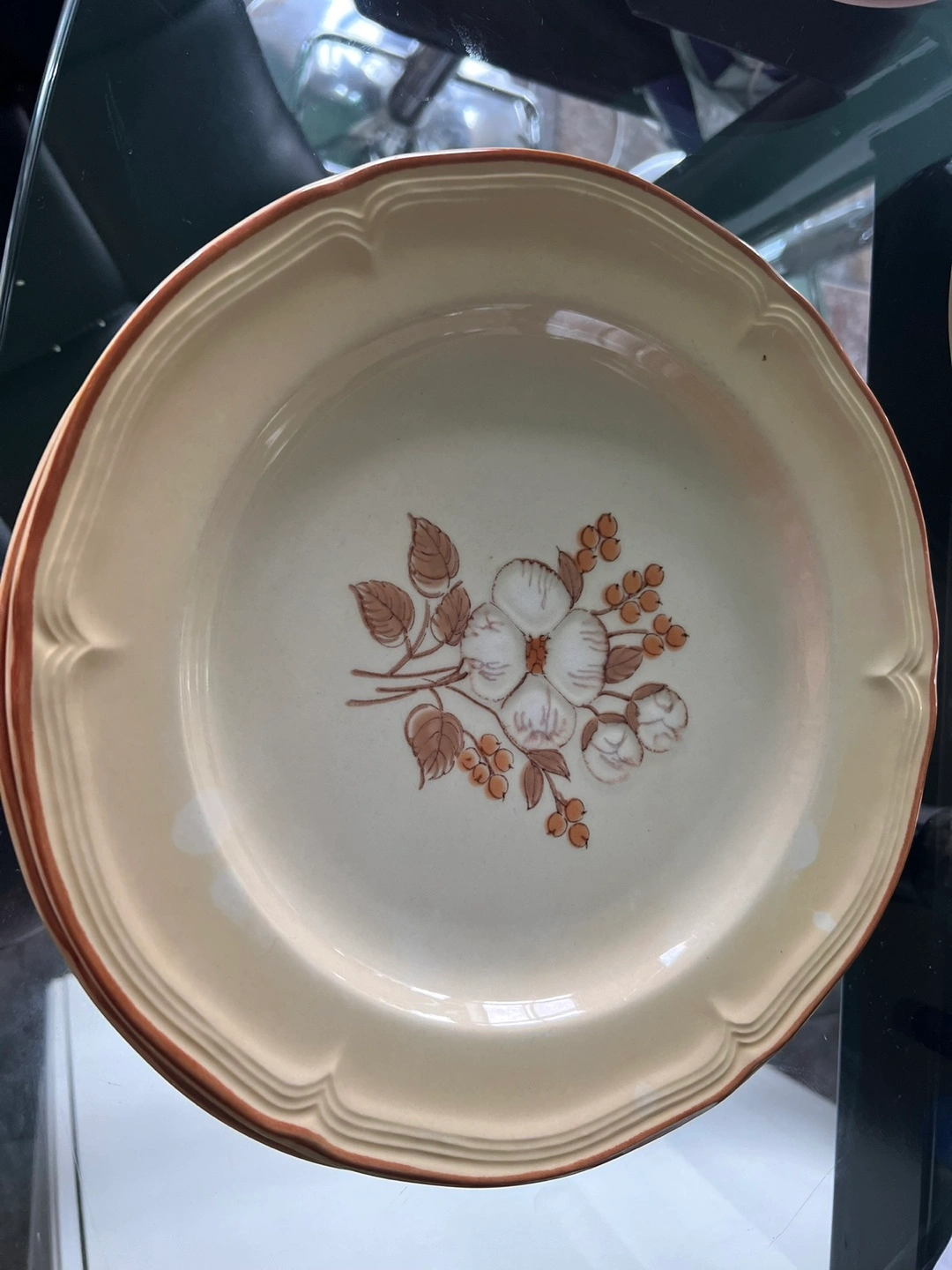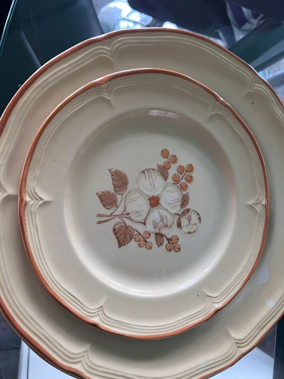 Two dinner plates and three side plates. Beautiful vintage International Charlene stoneware. Floral design. Oven and dishwasher safe. Microwave oven proof. Made in Japan.