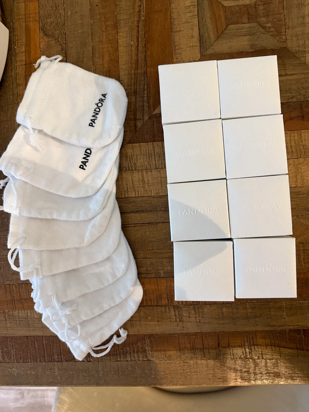Eight Pandora jewellery boxes and eight Pandora pouches. Perfect for organizing or gifting jewellery. Boxes are new and unused.
