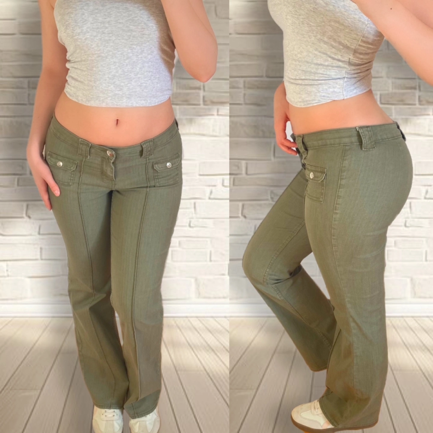 Fitted cargo pants in cotton-blend twill. Low waist, zip fly with button, and small patch pockets at top with flap and snap fastener. Stitched creases at front and wide, flared hems.