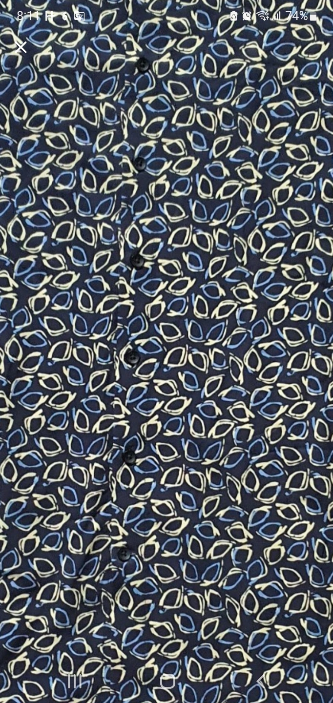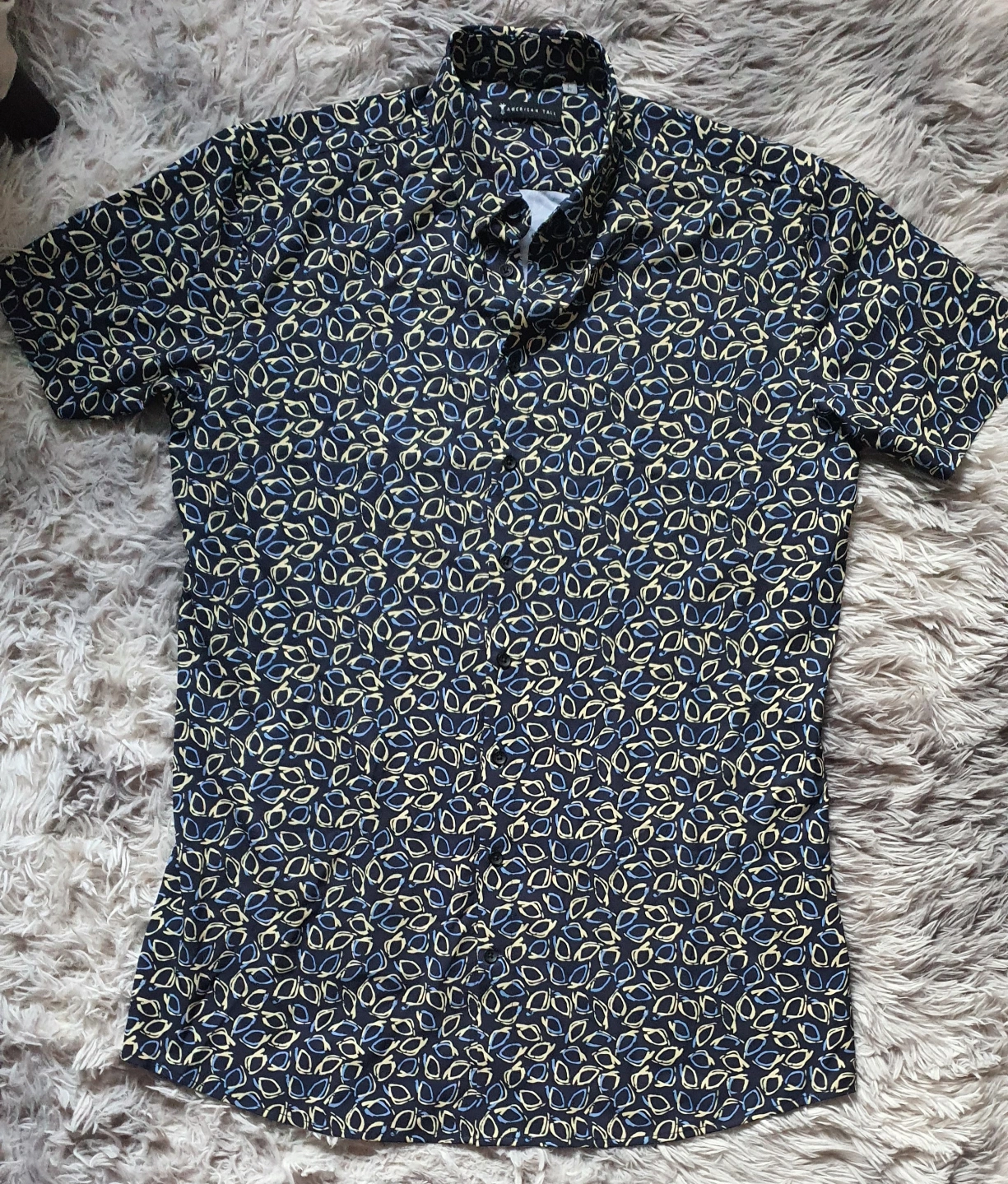 Stylish short sleeve button-up shirt. Black background with abstract pattern in blue and beige. Collared shirt, looks great for casual wear.