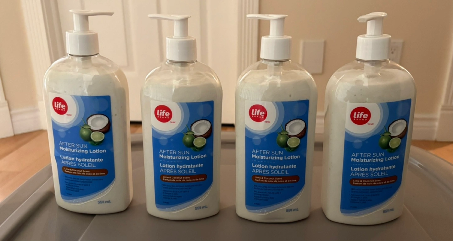 Four bottles of Life Brand After Sun Moisturizing Lotion. Lime and coconut scent. 591ml each. Pump bottles.