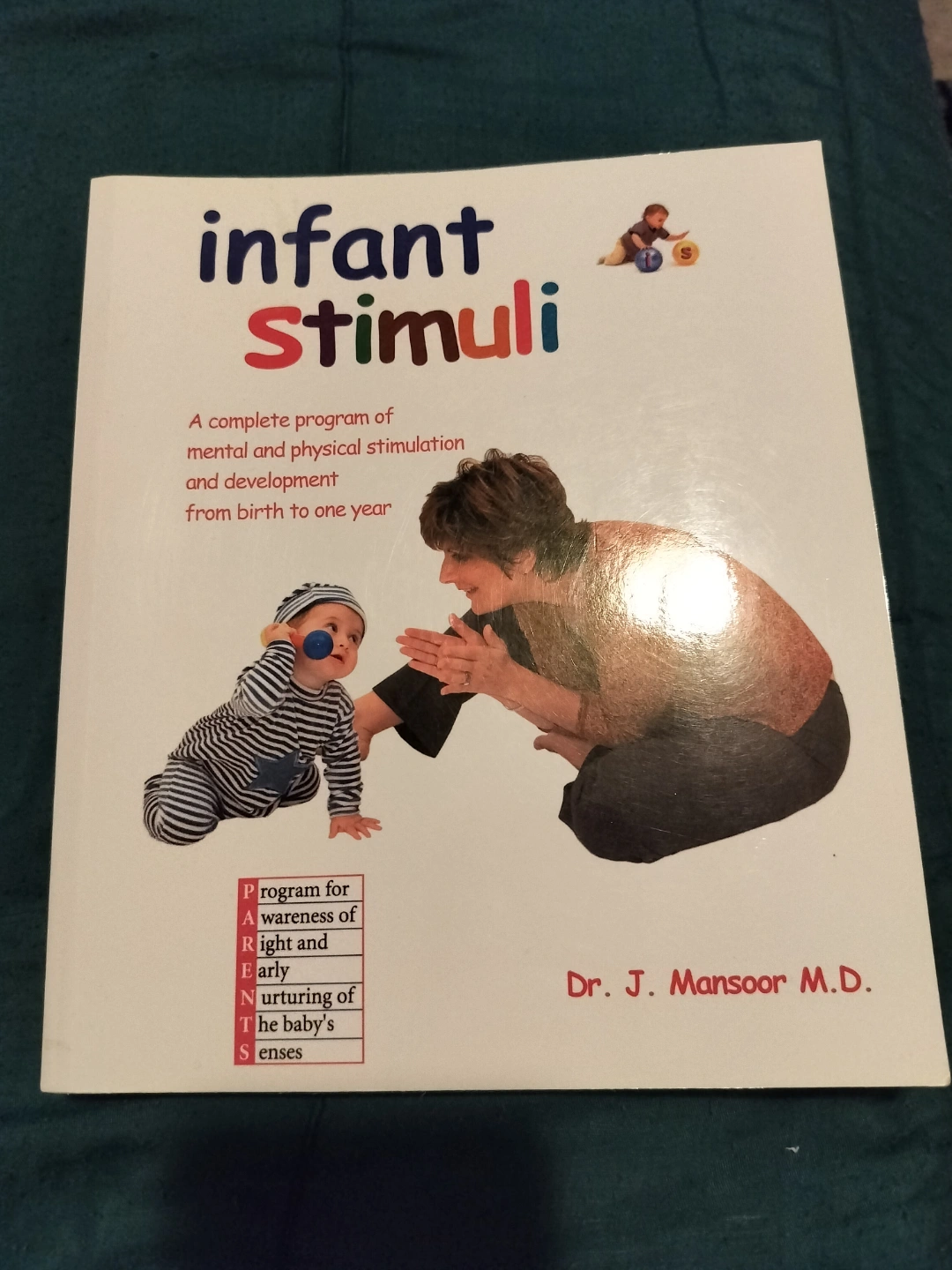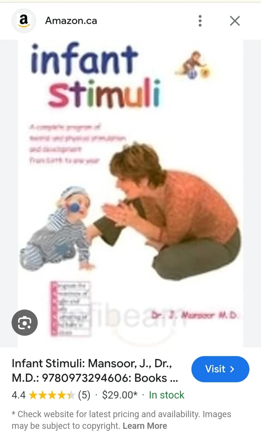 Book about infant development. Complete program of mental and physical stimulation from birth to one year. Author is Dr. J. Mansoor M.D. https://www.amazon.ca/Infant-Stimuli-J-Mansoor/dp/0973294604