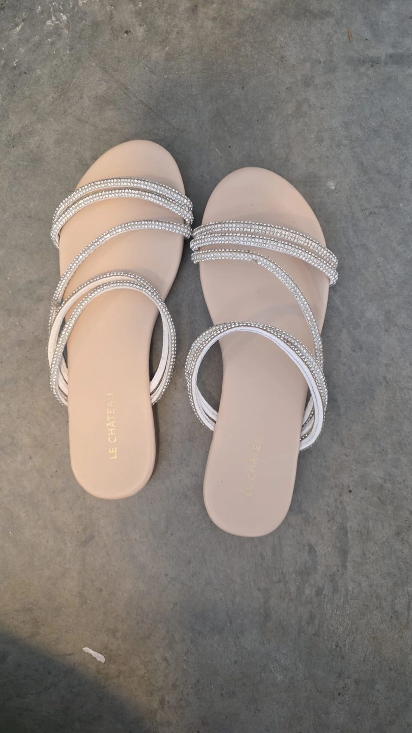 64Beige sandals with rhinestone detailing. Open toe and slide-on style. Size 38