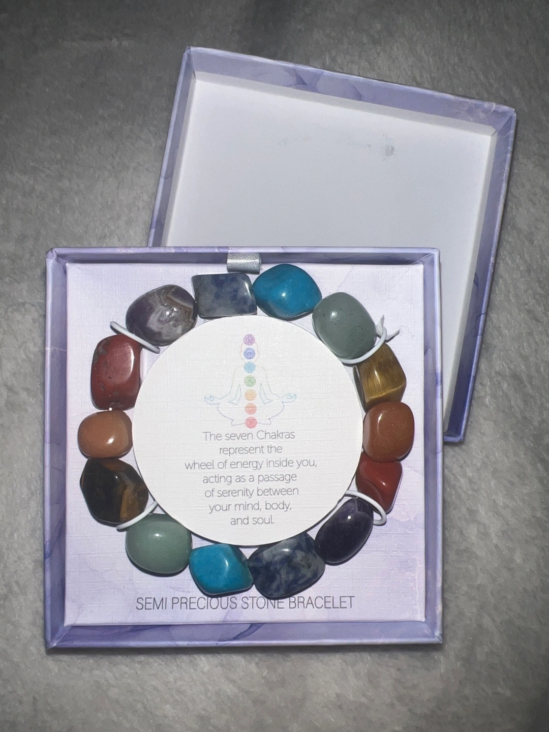 189Beautiful semi-precious stone bracelet. Seven chakra stones. Comes in a purple gift box. Perfect gift or treat for yourself.