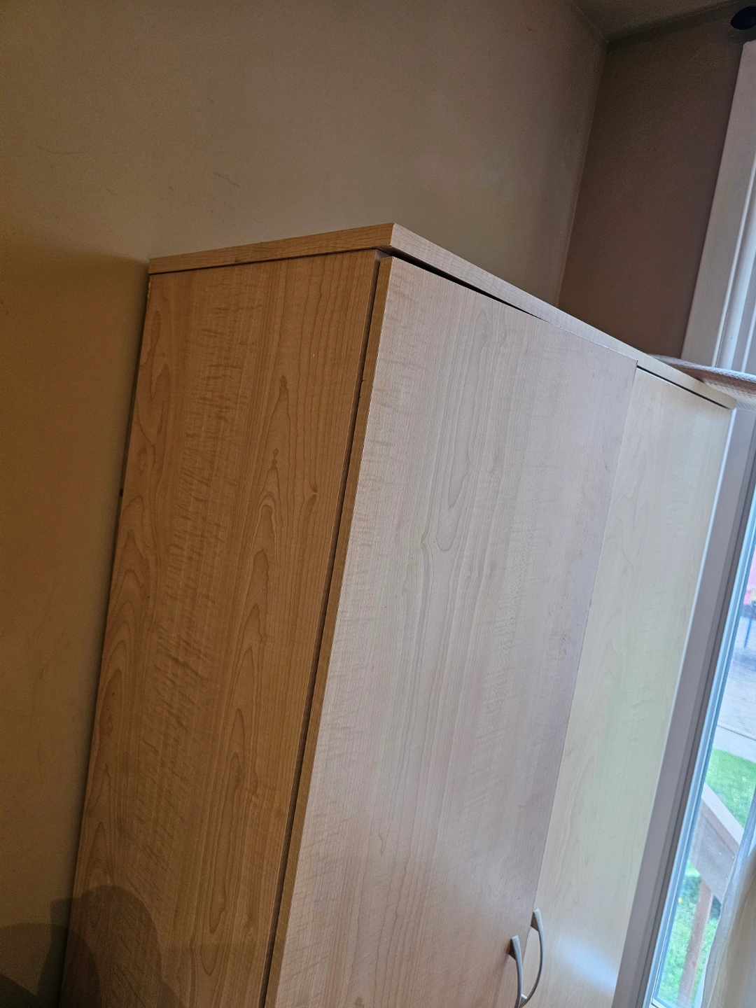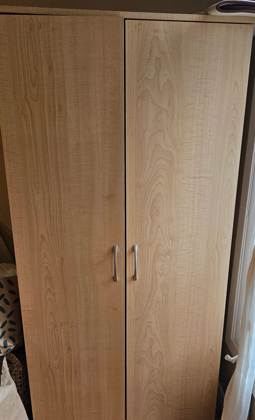 Double door wardrobe, light wood finish. Tall, narrow design. Good for smaller spaces. Silver tone handles.