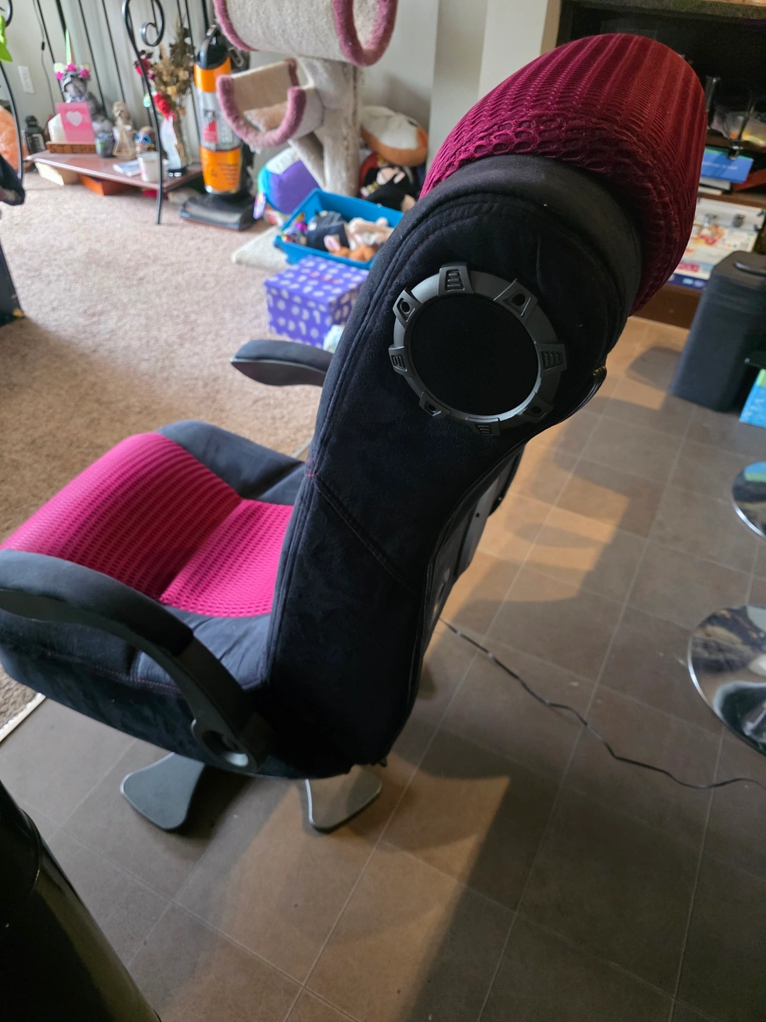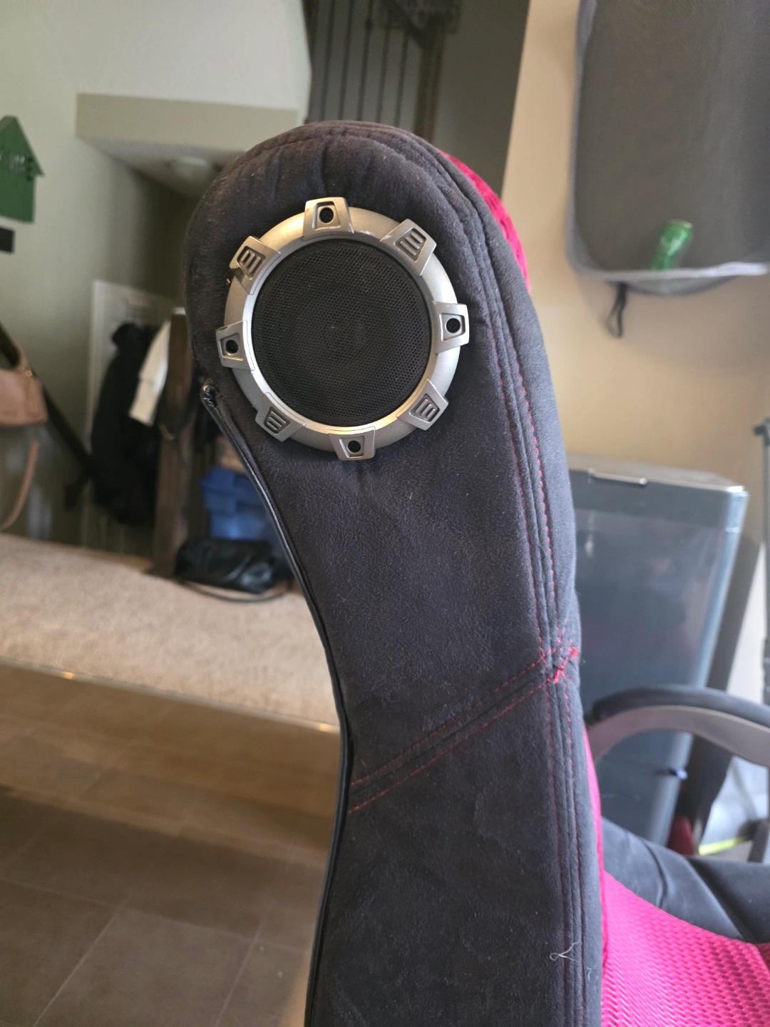 Gaming chair, maroon and black. Wireless Bluetooth. Includes built-in speakers and audio inputs. Used condition, has AUX hook up, RCA Jacks, takes USB as well, volume control, bass control, no rips or stains or tears, pretty loud as well.