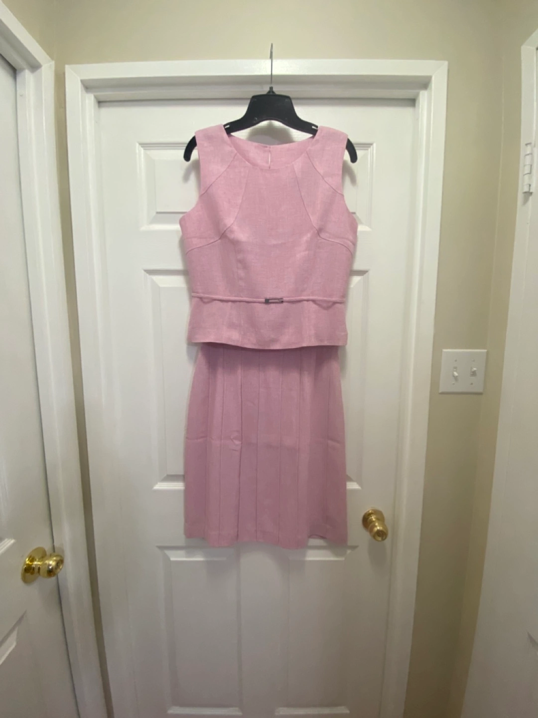 This dress suit features a pink, sleeveless top and pleated skirt. It also comes with a short sleeve blazer. This 3 piece ensemble is perfect for a sophisticated look.