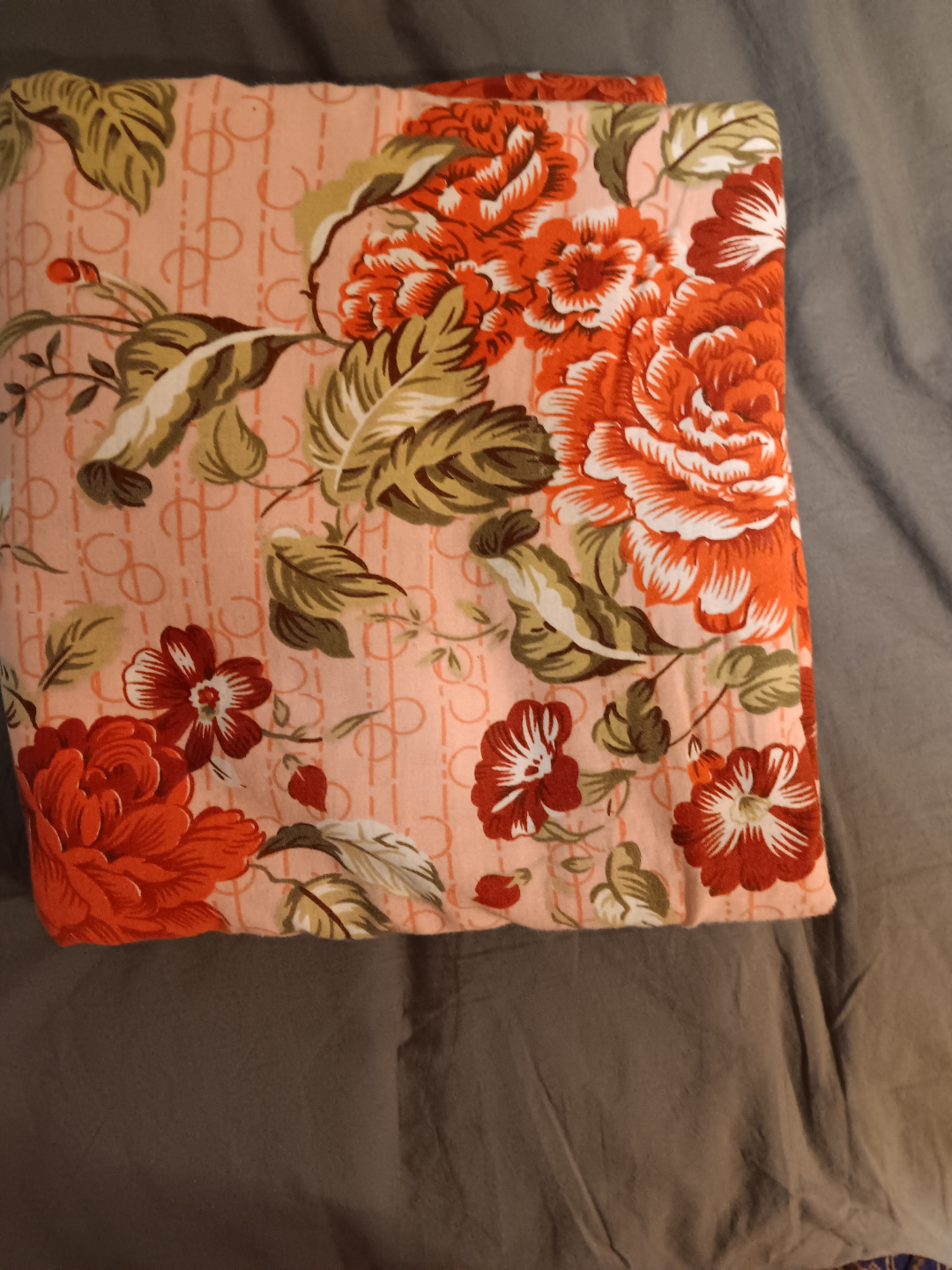 Peach/pink/red coloured cotton bed sheet. Features a repeating pattern of floral designs.