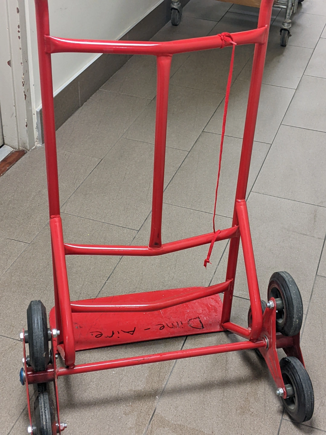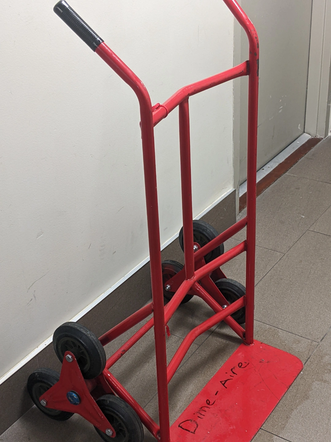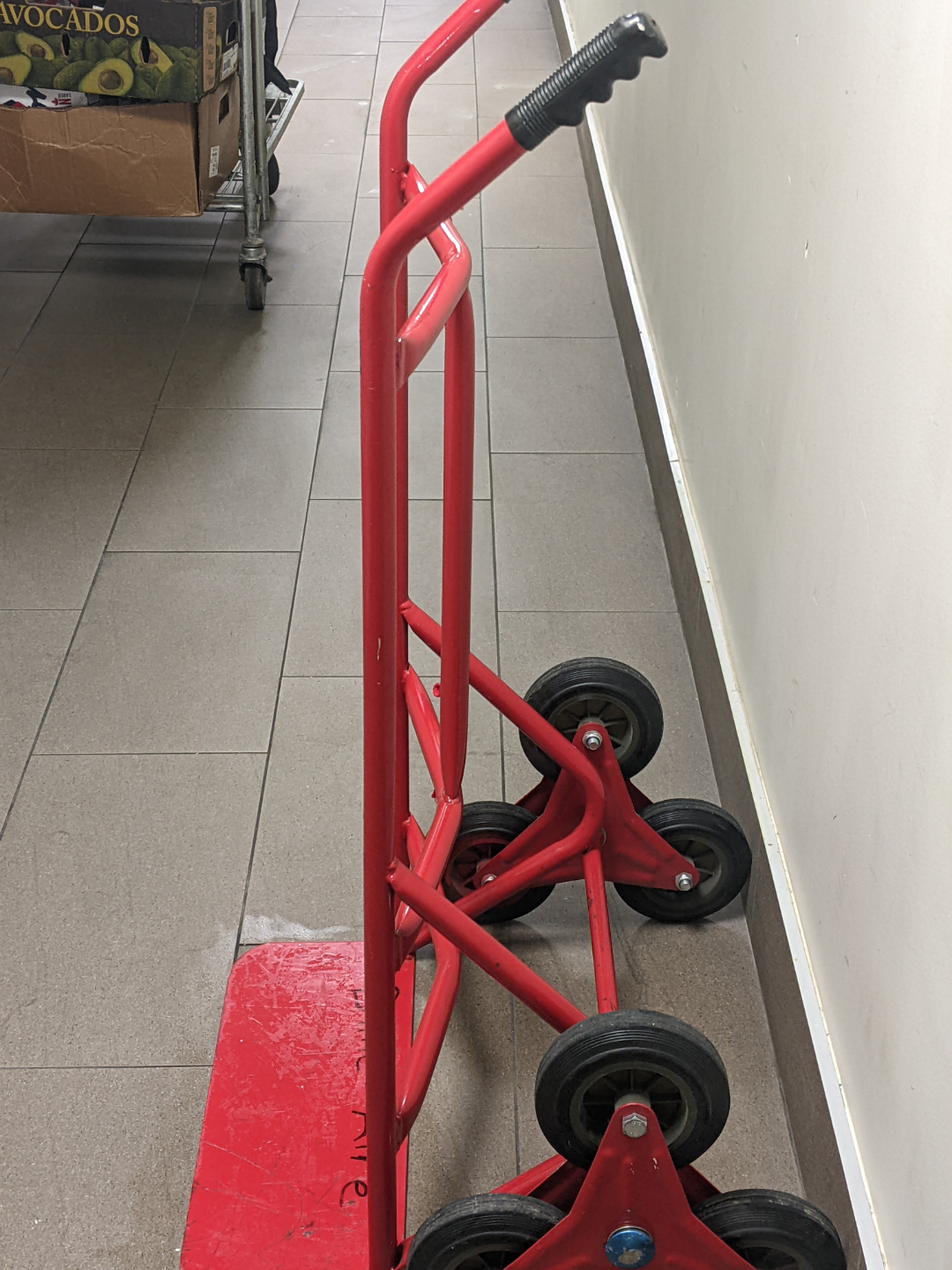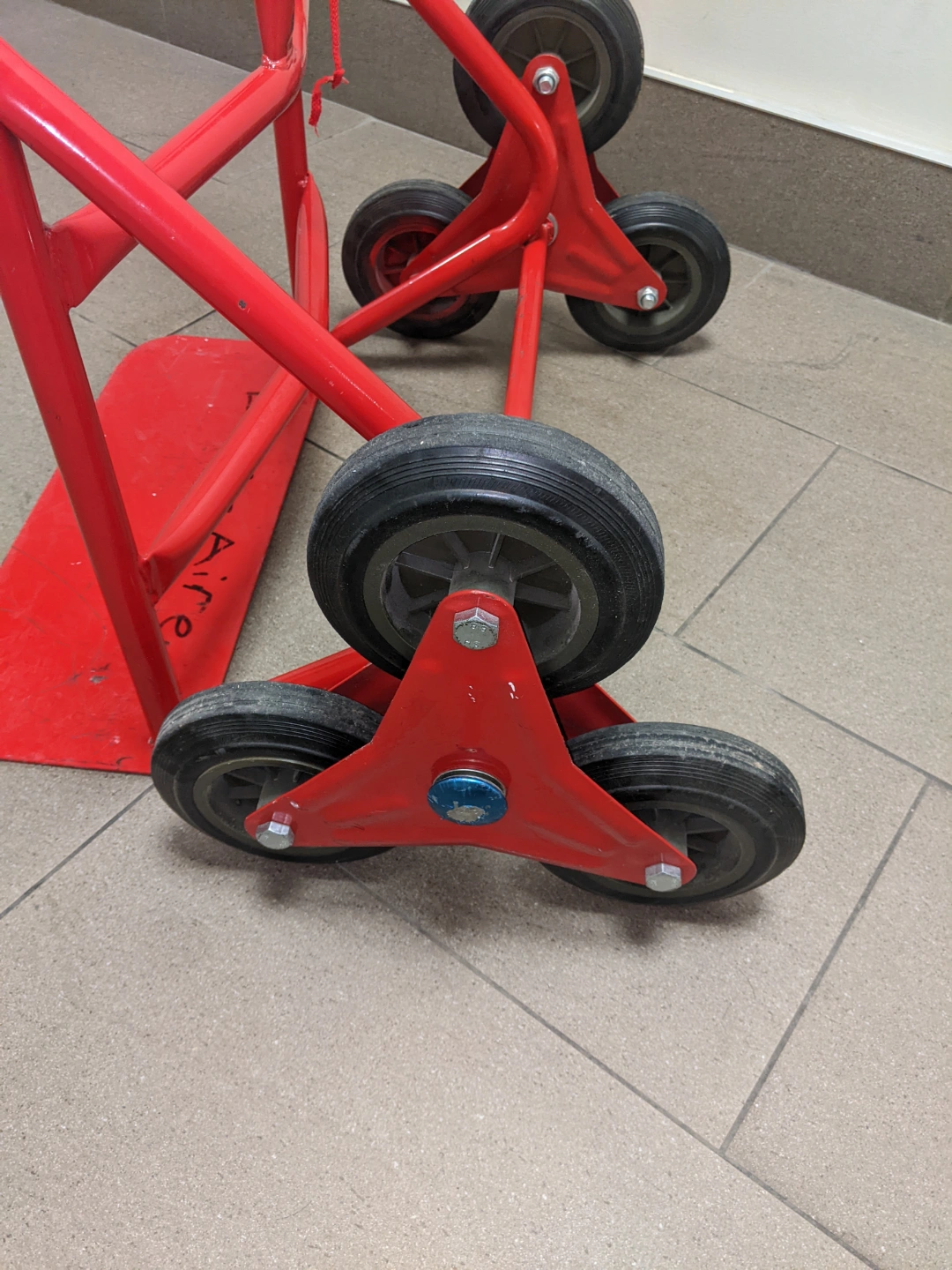 Durable, red, six-wheeled hand truck. Ideal for moving heavy items. Shows some wear.
