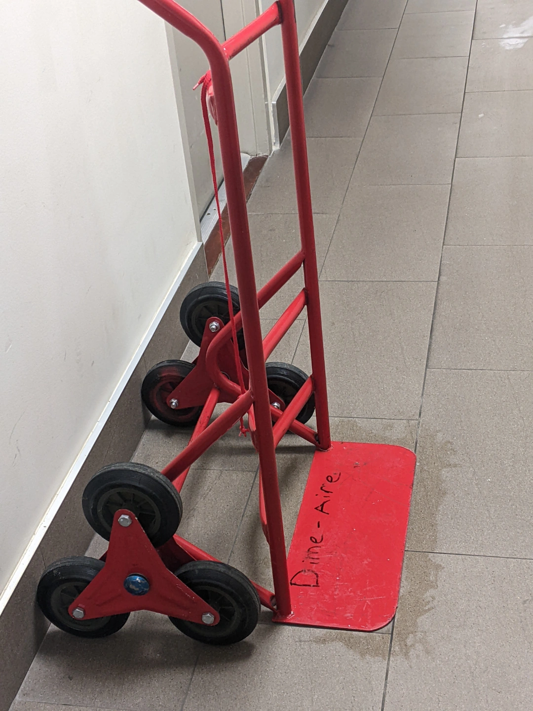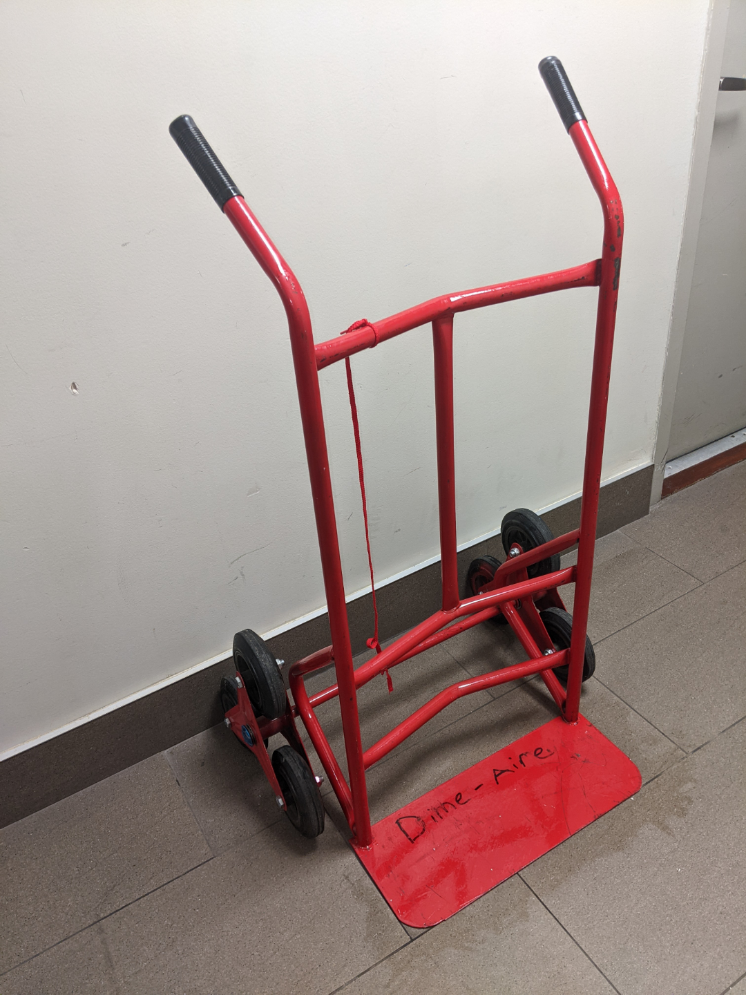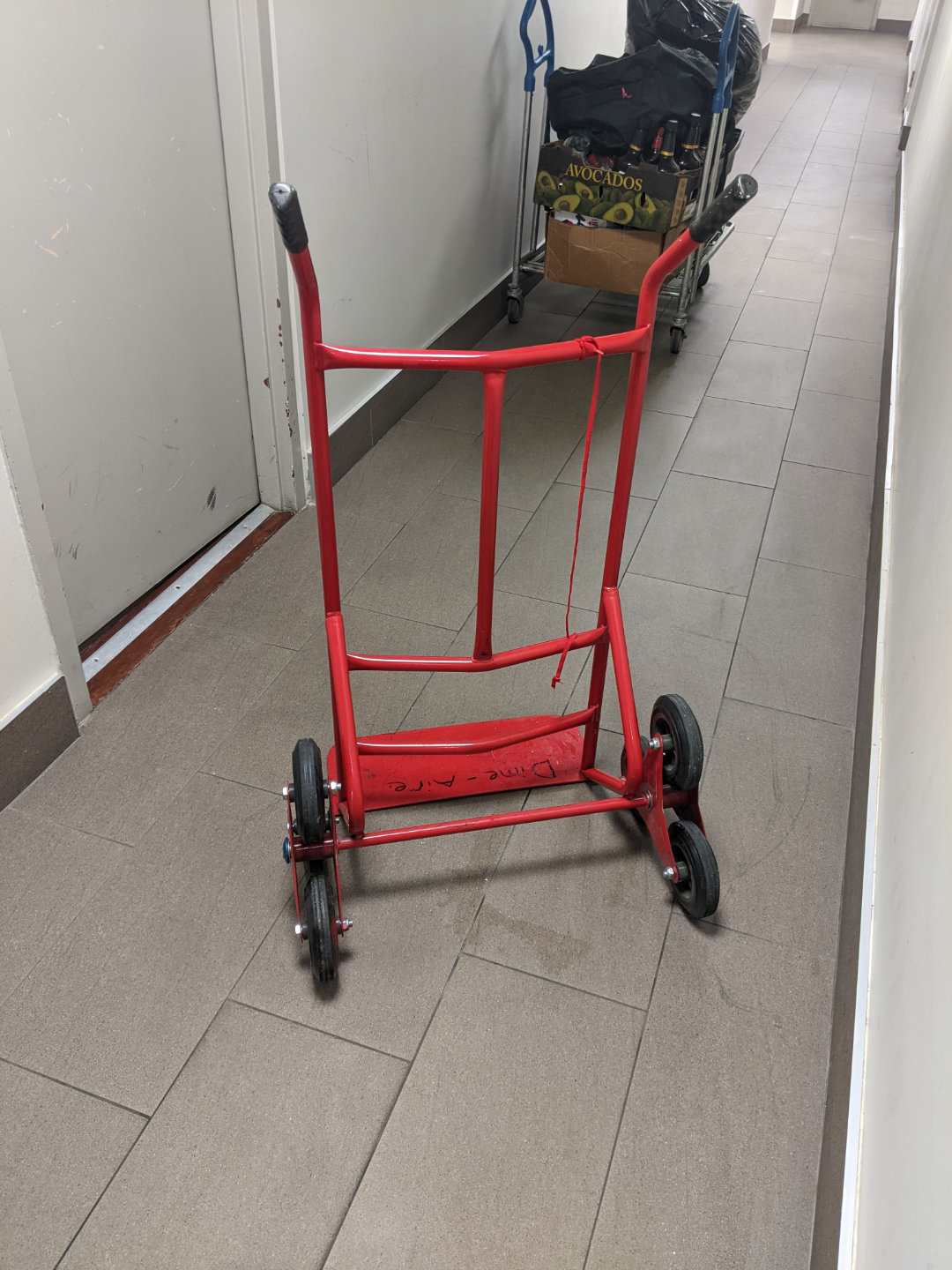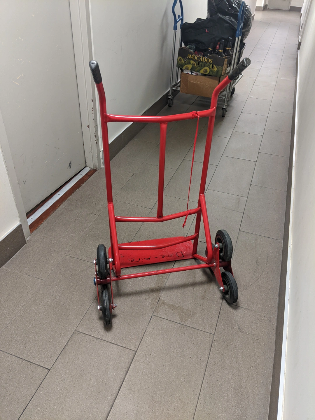 Durable, red, six-wheeled hand truck. Ideal for moving heavy items. Shows some wear.