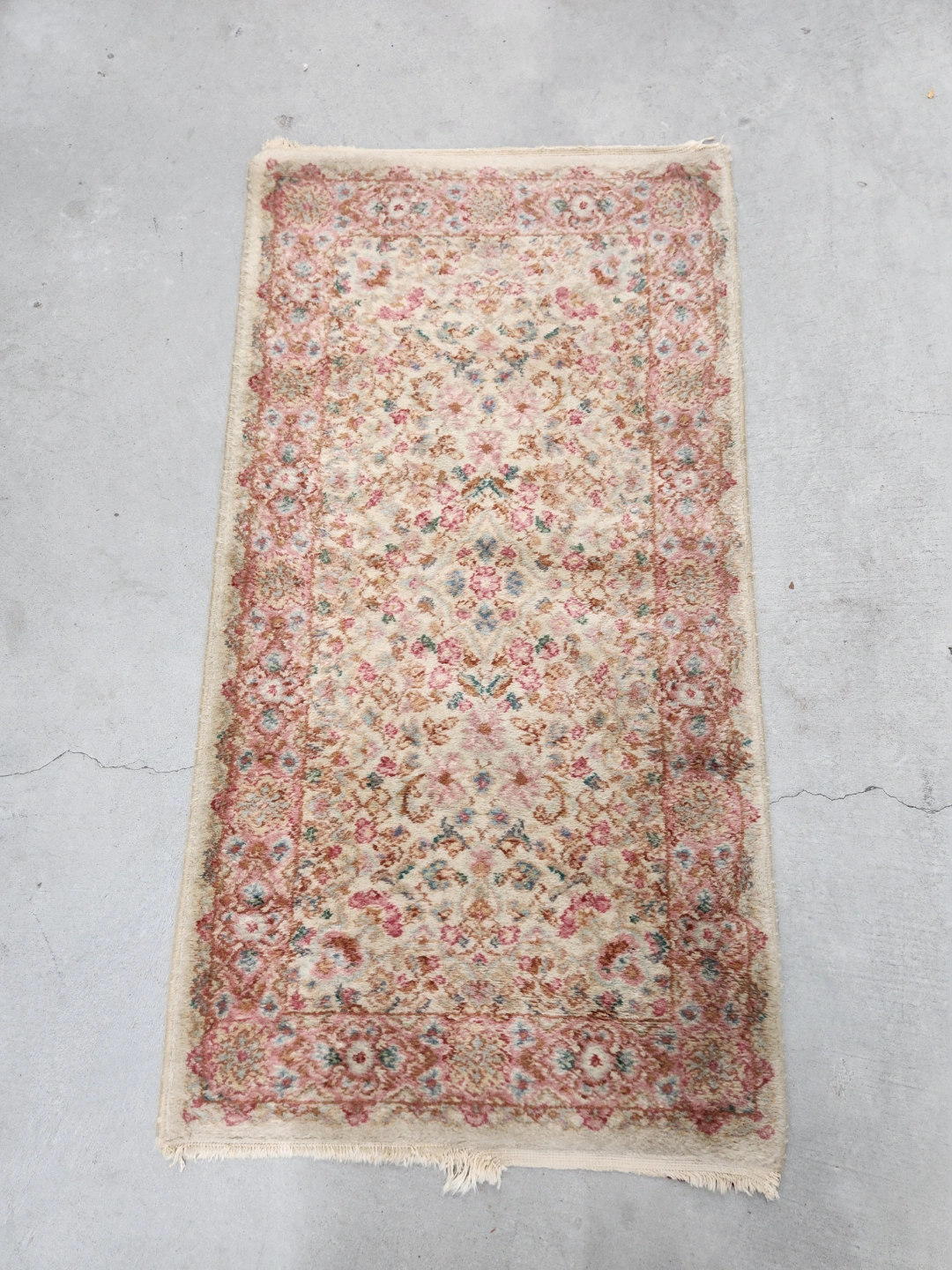Lovely vintage Sarouk runner rug. Features a delicate floral pattern in cream, pink, and brown tones. Shows some wear consistent with age and use. Soft and adds a touch of vintage charm.