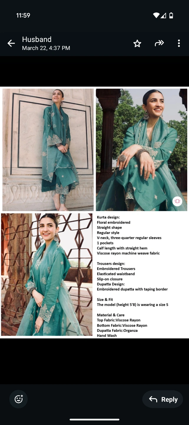 Beautiful teal three-piece kurta set. Floral embroidered kurta, trousers, and dupatta. Viscose rayon fabric. Hand wash.