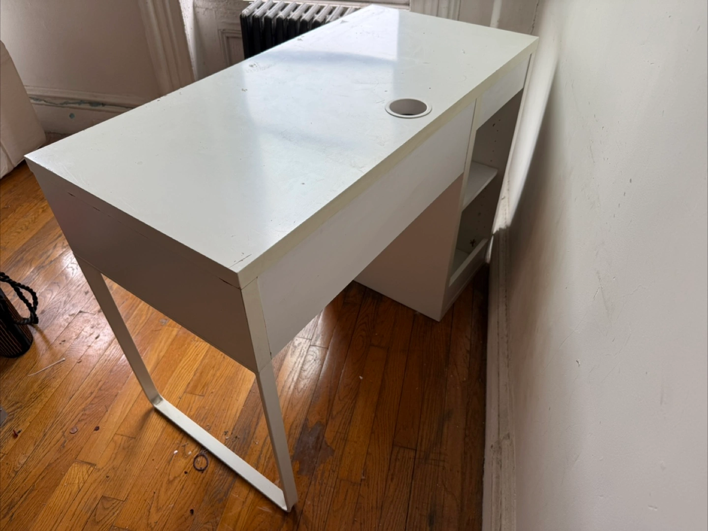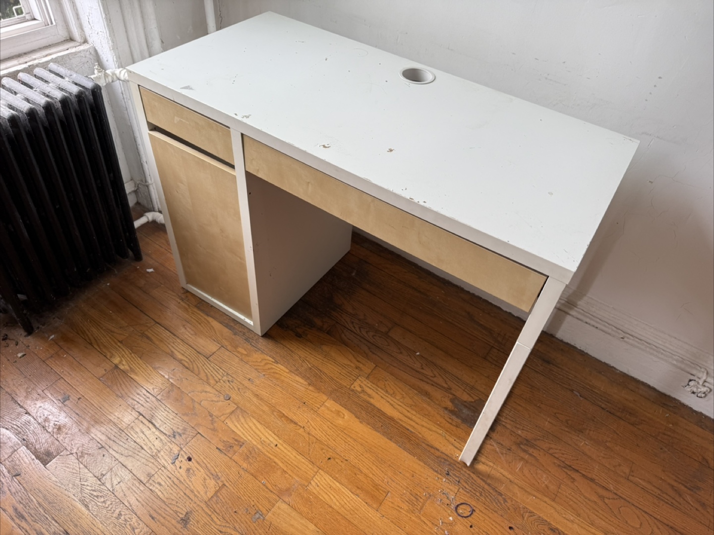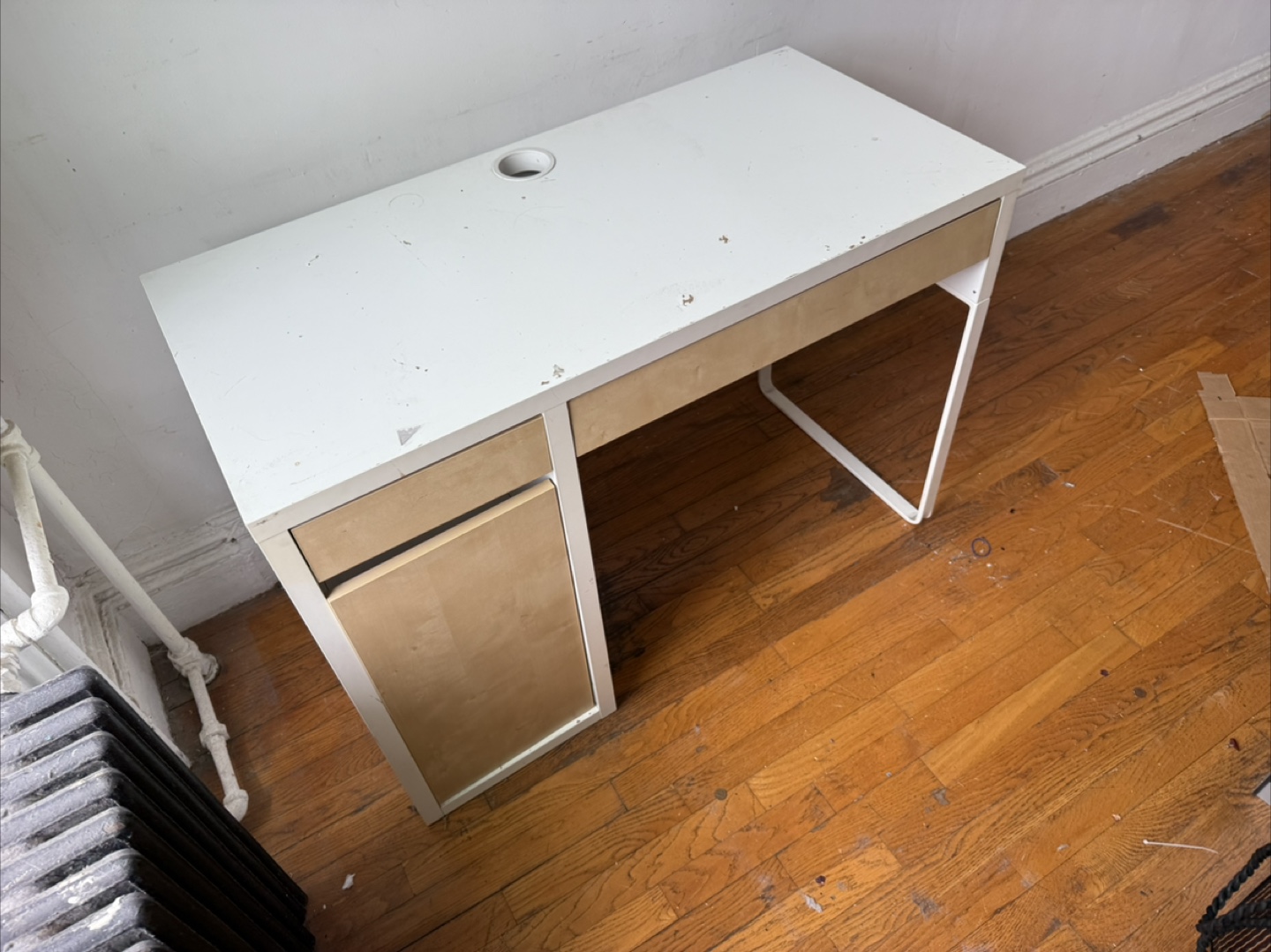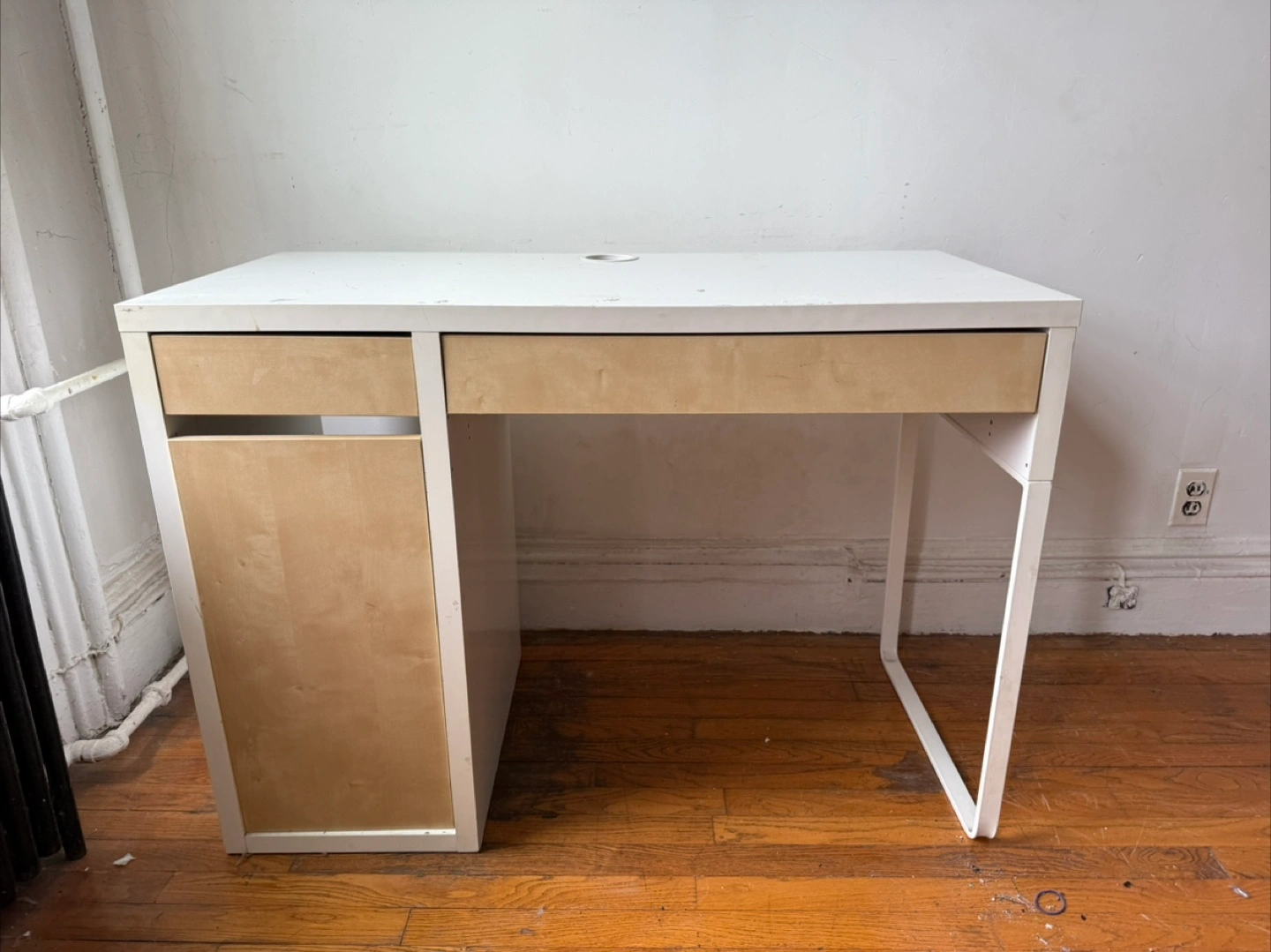 White and birch desk with two drawers, one cabinet, and metal legs. Minimalist design, with some surface paint peeling off.