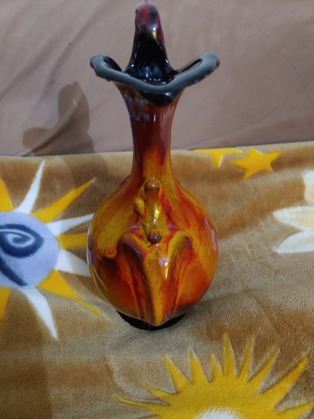 Ornate ceramic vase. Red and orange glaze. Intricate handle. good condition. Unique decor piece.