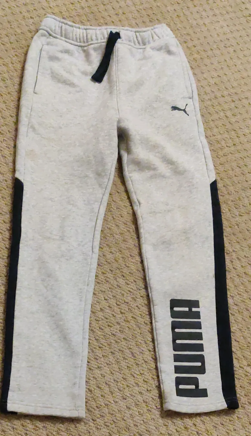 Grey Puma sweatpants with black side panels. Drawstring waistband. Excellent condition. Size L (10-12) yrs of age. Pickup from Richmond.