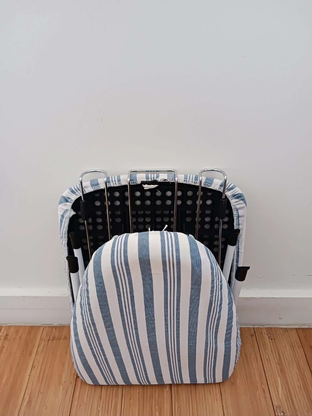 Small ironing board, foldable design. Features a blue and white striped cover. Includes a built-in iron rest.