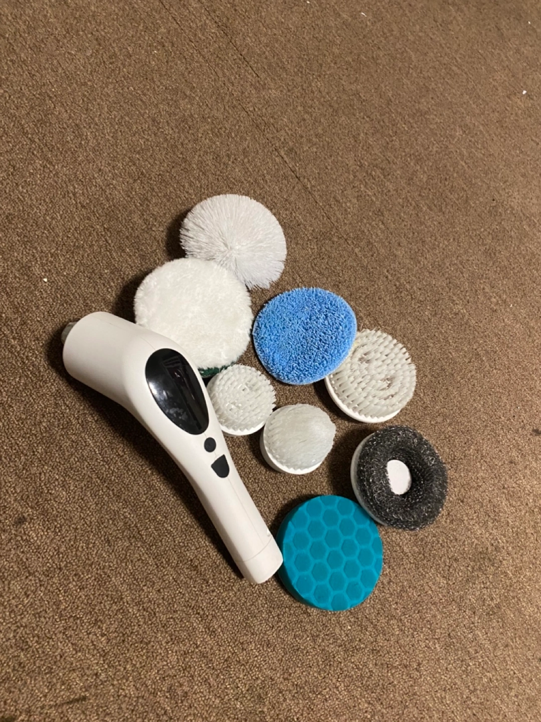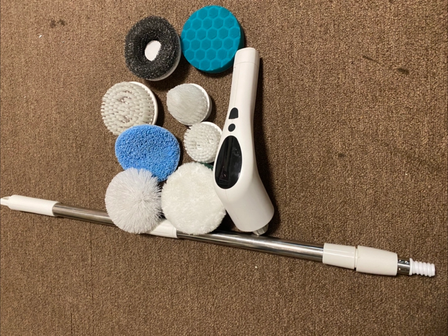 Electric power scrubber with various brush heads. Great for cleaning various surfaces. Includes extension pole. Multiple brush types for different cleaning needs.